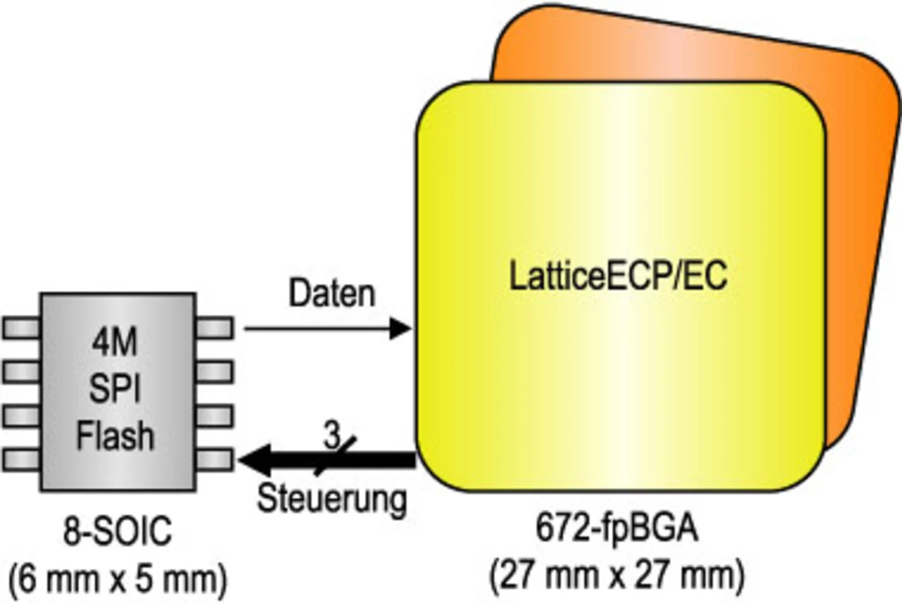 Bei den EC/ECP-FPGAs handelt es sich um SRAM basierende FPGAs, welche beim Einschalten geladen werden müssen. Dies kann entweder über einen Mikroprozessor, eine serielle oder parallele Schnittstelle oder über einen externen Boot-Baustein erfolgen. Damit die Kosten möglichst niedrig bleiben, lassen sich die EC/ECP-FPGAs direkt an SPI3- beziehungsweise SPI-Flash-Bausteine anschließen (Bild 4). Diese SPI-Flash-Speicher benötigen nur wenig Platinenfläche und sind kompatibel von 512 Kbit bis 32 Mbit. Typischerweise lassen sich diese Bausteine mit 20 MHz takten, was eine Ladezeit von ca. 265 ms bei einem 20-K-LUT-Baustein bedeutet. Nimmt man einen SPI-Flash-Speicher mit 40 MHz, wird diese Zeit entsprechend halbiert.