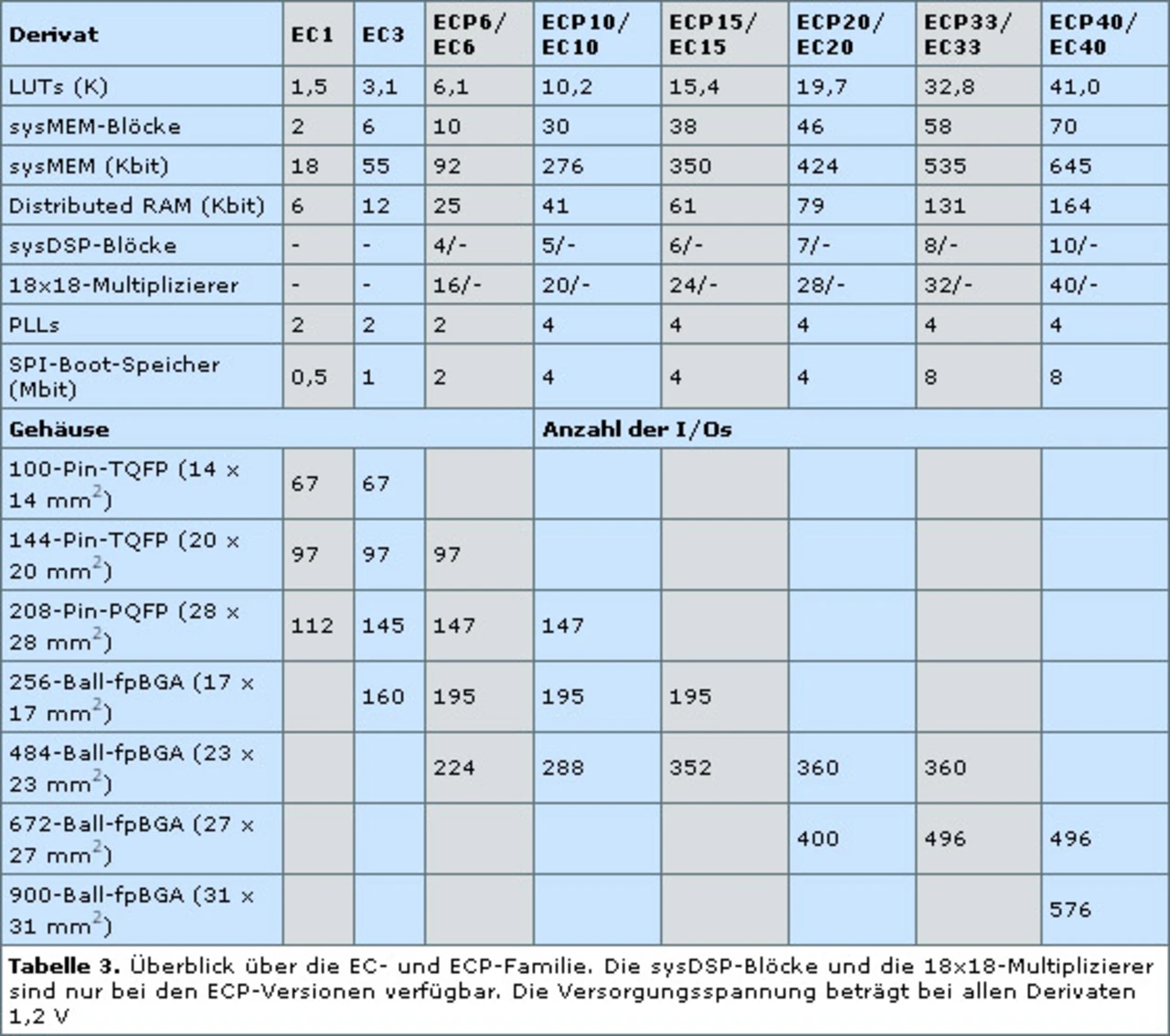 Die EC-Familie reicht von 1,5 K LUTs bis hoch auf 41 K LUTs (Tabelle 3). Die ECP-Familie startet bei 6 K LUTs und geht ebenfalls hoch bis auf 41 K LUTs. Die Bausteine EC20 und ECP20 sind bereits in Massenproduktion. Von allen anderen (bis EC/ECP33) gibt es Muster, wobei Stückzahlen bis Ende der ersten Quartals 2005 erwartet werden.