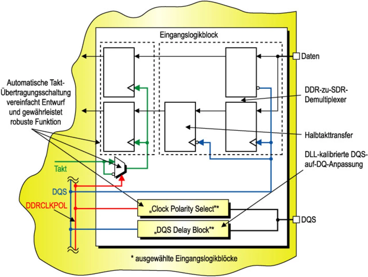 Mit dieser Methode ist es möglich, einen DDR-Speicher mit bis zu 400 Mbit/s zu betreiben. Ein IP-Core für den DDR-Speicher-Controller steht zur Verfügung.