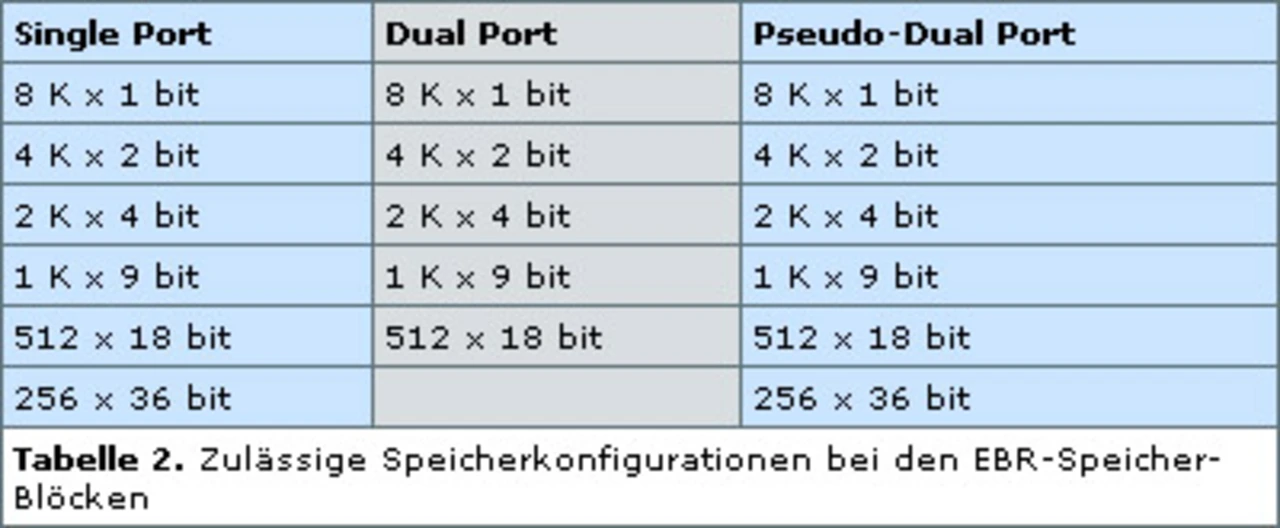 Diese Speicherblöcke sind 9 Kbit groß und zu jeweils 9 bit organisiert. In Breite und Tiefe lassen sie sich vom Anwender über den Module-Generator der Design-Software „ispLEVER“ konfigurieren. Tabelle 2 zeigt die Konfigurationsmöglichkeiten eines EBR (Embedded Memory RAM).