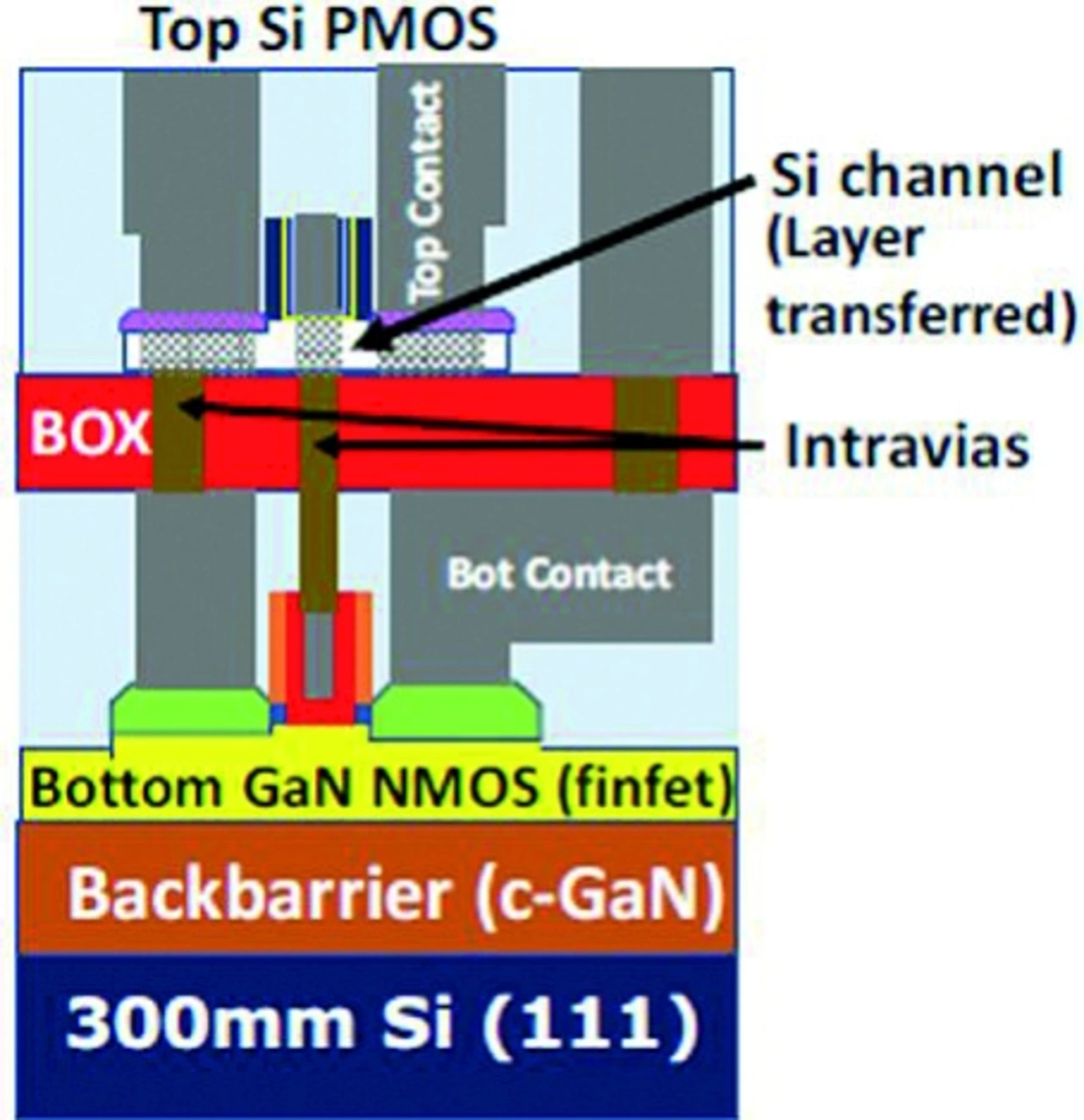 Genau darum ging es bei einem weiteren Intel-Vortrag, frei nach dem Motto: GaN trifft auf Moore’s Law. Die Forscher von Intel haben einen hochskalierten, leistungsstarken High-k-GaN-on-Si-NMOS-FinFET im Enhancement-Modus beschrieben, der auf einer 300-mm-Si-Plattform aufgebaut und in die Si-PMOS-FinFET-Technologie integriert wurde. Das heterogene Bauelement wurde durch eine von Intel auf der IEEE IEDM 2019 erstmals beschriebene Schichttransfertechnik möglich, mit der GaN-NMOS- und Si-PMOS-Bauelemente parallel produziert werden können. Der NMOS-GaN-FinFET weist die bislang schmalste GaN-Finne (Breite: 25 nm) auf, plus einer sehr kurzen Gate-Länge (30 nm). Der NMOS-FinFET wurde mit einem Si-PMOS-FinFET mit einer Breite von 35 nm integriert.