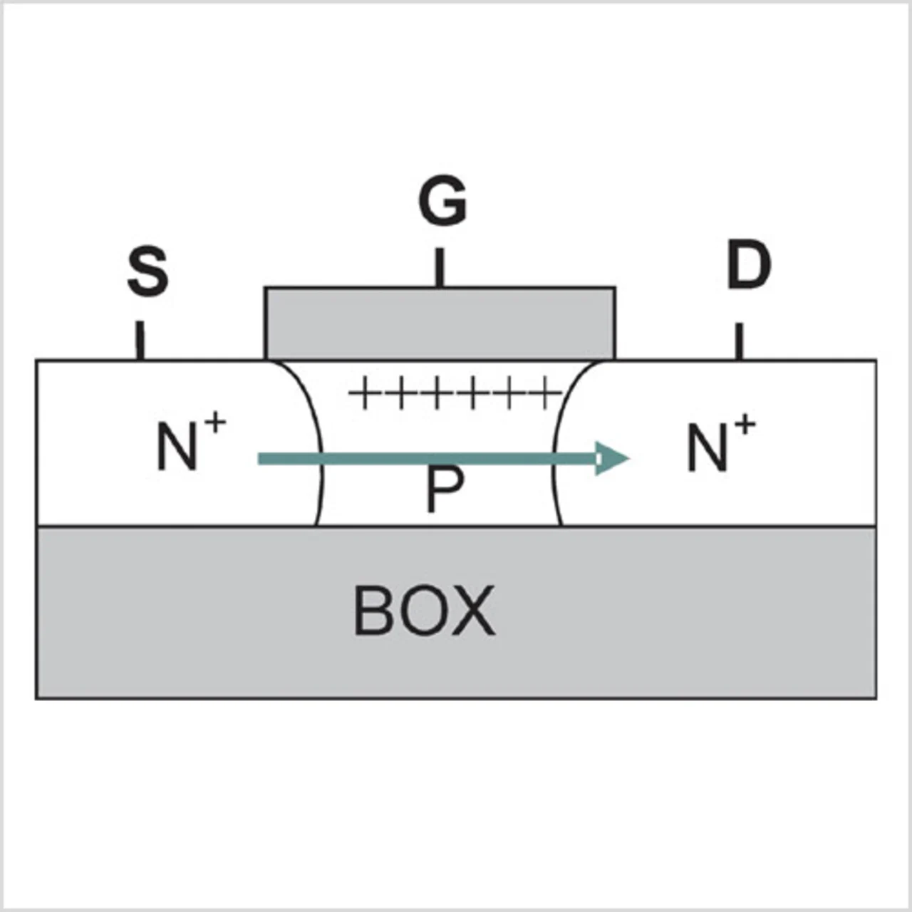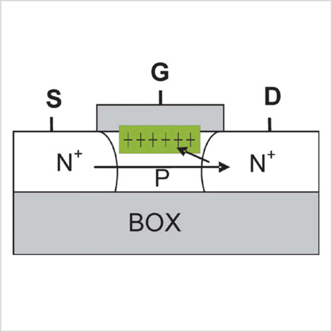 Ein Z-RAM-Speicher nutzt zum Aufbauen der Ladung den inhärenten Bipolartransistor innerhalb der SOIMOS-Struktur (Bild 1). Über den Bipolartransistor lässt sich wegen der größeren Kapazität der Speicherzelle eine wesentlich größere Ladung aufbauen. Bei einem n-Kanal-MOS-Transistor bilden die N+-Source, der P-Type-Body bzw. der N+-Drain den Emitter, die Basis bzw. den Kollektor eines npn-Bipolartransistors. Der Body des MOS-Transistors bildet die Basis des Bipolartransistors und dient als Speicherknoten.