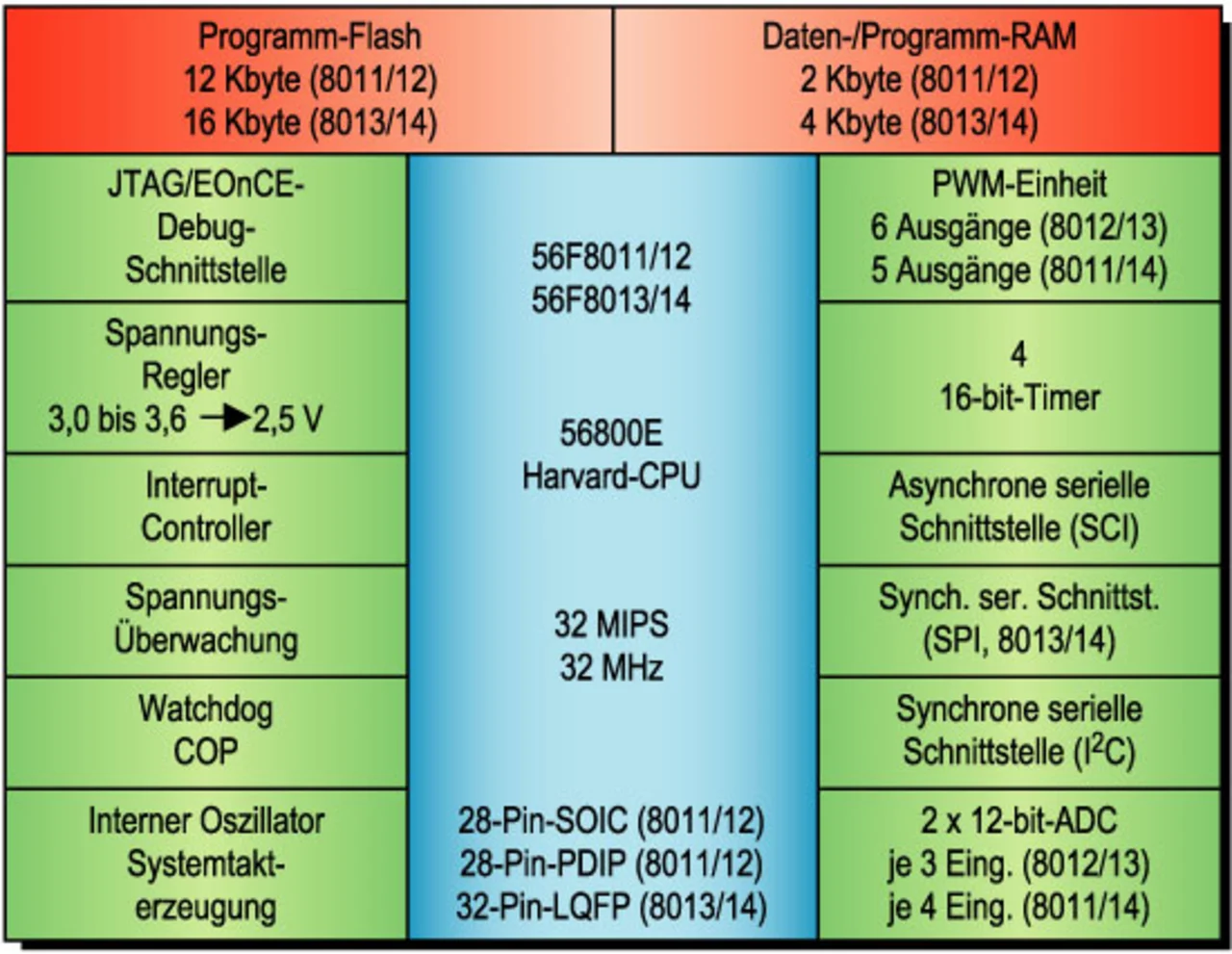 Der Kern der 56F801x-Controller ist eine typische Hybrid-CPU, die zum einen Signalprozessorleistung bietet und zum anderen auch typische Steuerungsaufgaben erledigt. Dazu unterstützt sie einen Software-Stackpointer, der es ermöglicht, Daten an Unterprogramme weiterzugeben oder Daten auf dem Stack vorzuhalten (lokale Variablen). Außerdem kann man in ANSI-C strukturiert programmieren und wiedereintrittsfähige Funktionen (z.B. im Multitasking-Betrieb) verwenden, die ein ablaufinvariantes Programm ermöglichen. Die CPU arbeitet mit Mehrzweck-Registern und einem orthogonalen Befehlssatz. Das erhöht den Code- und Compiler-Wirkungsgrad und erleichtert zudem die Programmierung. Als Daten kommen die gängigen Typen Integer (8, 16 und 32 bit), Fest- und Gleitkomma sowie die für die Signalverarbeitung typischen Bruch-Zahlen (Fractional) zum Einsatz. Die für Steuerungsaufgaben wichtigen Bitmanipulations- und Bitabfragebefehle, die charakteristisch für Mikrocontroller sind, sind darüber hinaus ebenfalls implementiert. Typisches Erbe eines Signalprozessors sind die MAC-Einheit (in einem Taktzyklus), Hardware-Schleifen, Modular-Arithmetik für Ringpuffer und die Unterstützung von „Fractional“- Arithmetik auf Hardware-Ebene.