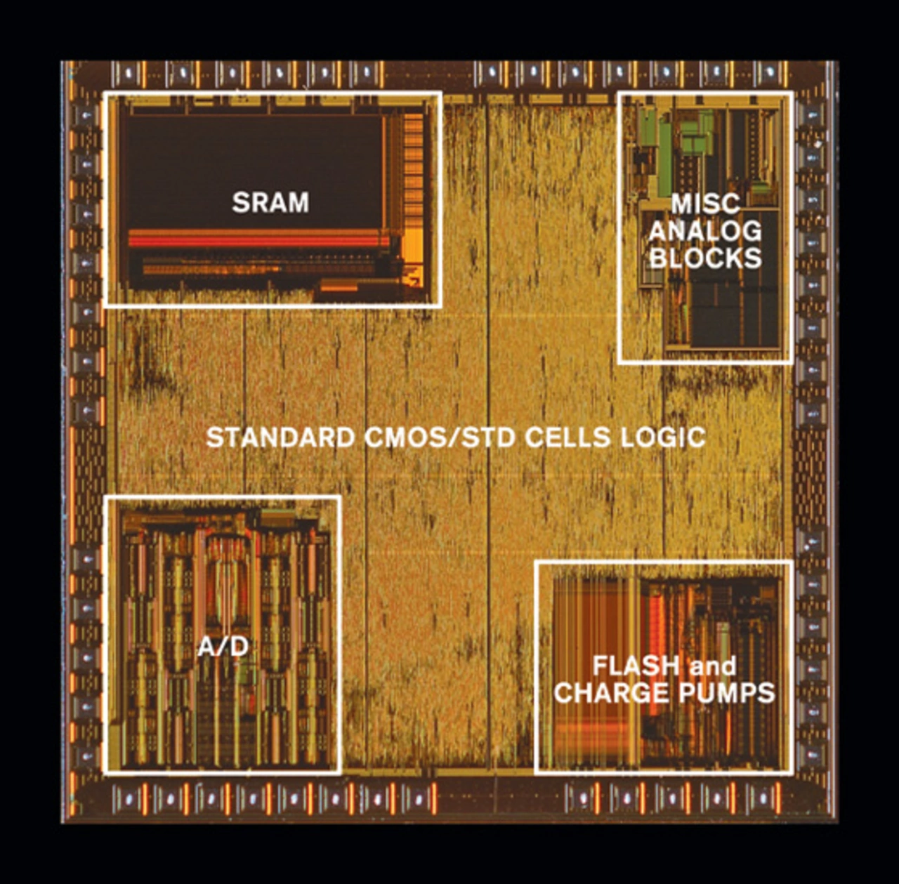 Bild 2. Das Chipfoto eines DSC-Bausteins der Familie 56F801x zeigt die lokale Aufteilung von A/D-Umsetzer, Analogblö-cken, SRAM und Flash-Speicher. Die CPU ist Teil der Standard-CMOS-/Standardzellen-Logik.