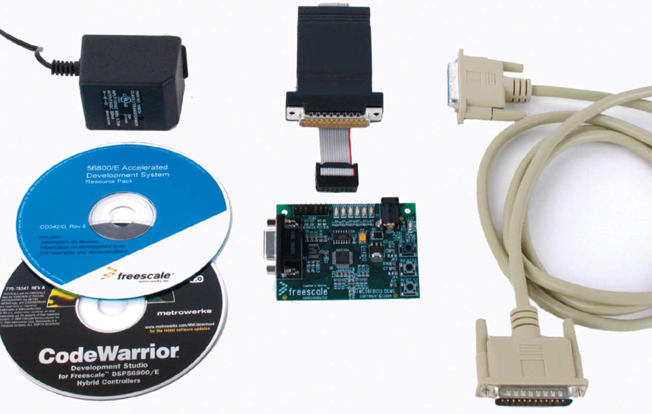 Bild 4. Lieferumfang des Entwicklungskits für die Bausteine 56F8013/14, bestehend aus einem Demoboard mit JTAG/EOnCE-zu-Parallel-Port-Schnittstelle, Software, Kabel, Stromversorgung und Dokumentation.