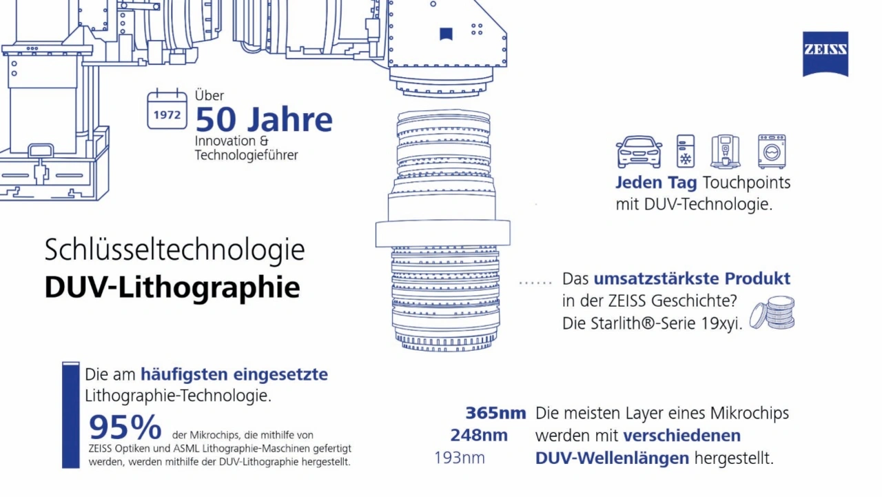 Allein die Zahlen sind beeindruckend: 80 Prozent aller weltweit gefertigten Mikrochips werden mit den Optiken von ZEISS Semiconductor Manufacturing Technology (SMT) hergestellt. Mehr als 95 Prozent ihrer Strukturen entstehen mit Hilfe von DUV-Licht (Deep Lltraviolet Light) bei Wellenlängen von 193, 248 oder 365 nm. Damit sind optische Auflösungen von bis zu unter 40 nm, auf Mikrochips möglich. Die derzeit am Markt erhältlichen modernsten und leistungsstärksten Mikrochips weisen bis zu 100 Schichten – sogenannte Layer – auf. Dabei enthalten alle Mikrochips Layer, die mithilfe von DUV-Licht entstehen. Bei einigen High-End-Chips nutzen Chiphersteller für weitere Lagen zusätzlich EUV-Lithographie (Extrem Ultraviolettes Light) – die derzeit fortschrittlichste Technologie in der Serienfertigung.