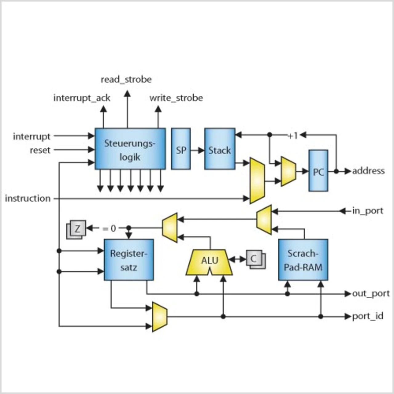 Der PicoBlaze ist aus mehreren Funktionsblöcken aufgebaut, die direkt oder über Multiplexer miteinander verbunden sind. Bild 1 zeigt die interne Prozessorstruktur, die unmittelbar aus der VHDL-Beschreibung rekonstruiert ist. Die Steuerlogik mit Schnittstellen-Signalen, ein Return-Stack mit einem Stack-Pointer SP und ein Befehlszähler PC mit dazugehöriger Inkrementierund Lade-Logik bilden das Steuerwerk. Das Rechenwerk umfasst den Registersatz, eine arithmetisch-logische Einheit (ALU), zwei Statusbits (C und Z), einen Notizblock-Speicher (Scratch-Pad-RAM) sowie Ein-/Ausgabe-Ports.