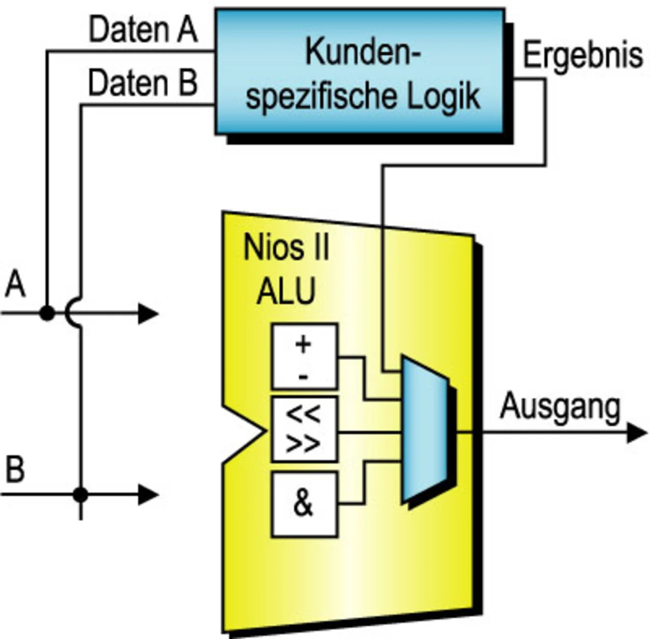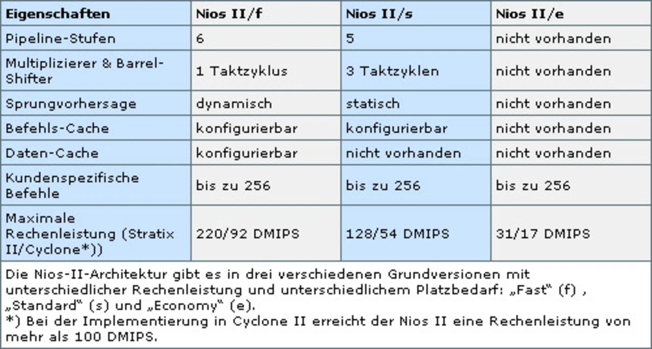 Die Nios-II-Familie besteht aus drei 32-bit-Soft-CPU-Cores (Tabelle): einen für maximale Rechenleistung (bis zu 220 DMIPS in Stratix II), einen optimiert für Logik-Effizienz (500 bis 800 Logikelemente) und einen für eine ausgewogene Kombination aus beiden Kriterien. Alle drei Cores arbeiten mit 32 bit breiten Datenpfaden und sind Code-kompatibel – damit haben Entwickler die Möglichkeit, die CPU-Konfiguration zu wechseln ohne Einschränkungen bei den bereits getätigten Software-Investitionen. Auf dem Erfolg der Vorgänger-Generation aufbauend, bietet Nios II eine signifikante Steigerung der Rechenleistung bei weniger Logik-Ressourcen. Im Gegensatz zu Standard-CPUs und anderen FPGA-Lösungen lässt sich der Befehlssatz des Nios II mit bis zu 256 anwenderspezifischen Befehlen erweitern. Mit selbstdefinierten, mächtigeren Befehlen können insbesondere zeitkritische Aufgaben gelöst werden. Der Nios-II-Prozessor wird darüber hinaus von mehr als 60 Peripheriefunktionen unterstützt – mit vielfältigen Kombinationsmöglichkeiten. Zu den Funktionsblöcken gehören u.a. Ethernet-, USB- und Speicher-Controller. Der SOPC-Builder als Bestandteil der Design-Software Quartus-II von Altera unterstützt alle 60 Peripheriefunktionen. Mit einem Wizard-basierten Tool lassen sich auch eigene kundenspezifische Logikfunktionen einfach integrieren.