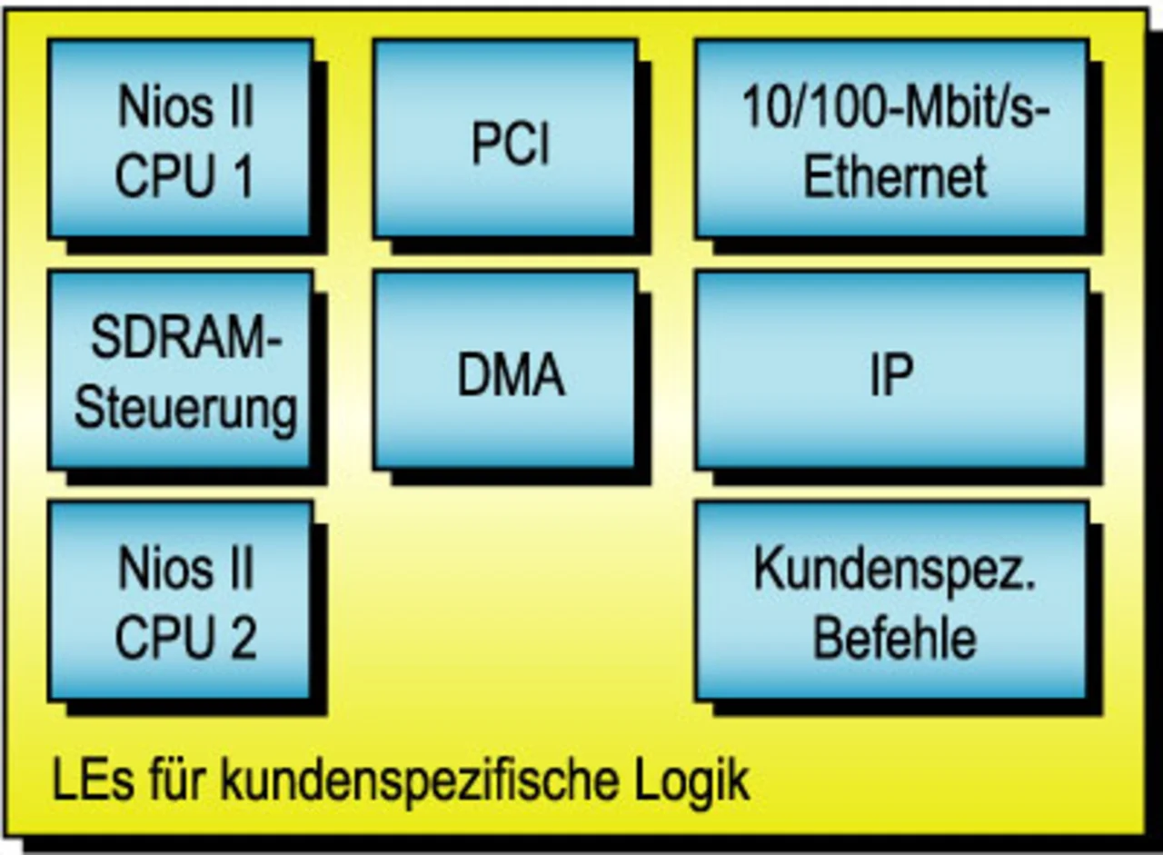 Doch zurück zu unserem Beispiel. Mit den Cyclone-II-FPGAs und dem Embedded-Prozessor Nios II kann man beispielsweise die DSP-Funktion in dem Nios-II-Prozessor implementieren, wodurch ein Viertel der vorher benötigten Bauteile eliminiert wird. Für sehr DSP-lastige Applikationen bietet der kundenspezifische Befehlssatz des Nios-II-Prozessors spezielle Funktionen, die in Hardware implementiert schneller ablaufen. Ist eine noch höhere DSP-Leistung gefordert, kann auch der gesamte DSP-Funktionsumfang in Hardware realisiert werden, indem man eine Kombination von Altera-IP und kundesspezifischer Hardware einsetzt. Die in den Cyclone-II-Bausteinen eingebetteten Multiplizierer können beispielsweise dazu verwendet werden, komplizierte mathematische Befehle schneller als auf Hochleistungs-DSPs abzuarbeiten. Der Nios-II-Prozessor würde in einer solchen Implementierung dann dazu eingesetzt werden, die Steuerfunktionen, die sonst normalerweise vom DSP durchgeführt werden, zu übernehmen.