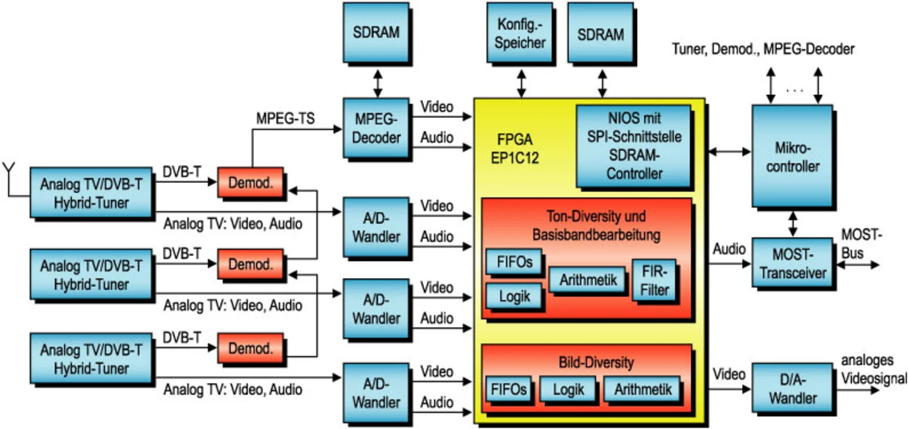Schon mit der ersten Generation von Cyclone-FPGAs und Nios-Prozessoren konnten leistungsfähige Designs realisiert werden. Ein Beispiel ist der Auto-TV-Empfänger von Hirschmann Electronics (Bild 4), der analogen und digitalen TV-Empfang bietet. Die Cyclone-FPGAs ermöglichten hier die kosteneffektive Implementierung von DSP-Funktionen. Mit dem SOPC-Builder wurde der Nios-Prozessor entwickelt, der für die Antennen-Steuerung erforderlich war.