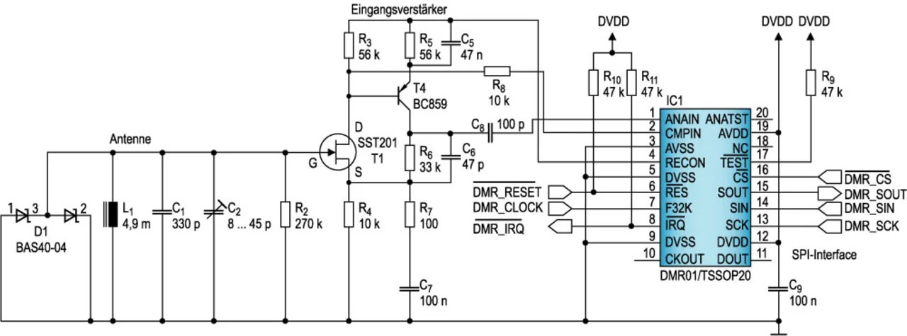 Die Empfangsschaltung kann mit einem zusätzlichen Eingangsverstärker empfindlicher gemacht werden. Der Schaltplan (Bild 6) zeigt den Aufbau mit einem zweistufigen, rauscharmen Vorverstärker. Über den Eingang „RECON“ kann der Vorverstärker automatisch abgeschaltet werden, wenn der DMR01 in den Sleep-Modus gebracht wird. Die Anbindung an den Mikrocontroller erfolgt über ein SPI-Interface. Der Controller liefert auch den für den Betrieb notwendigen 32-kHz-Takt.