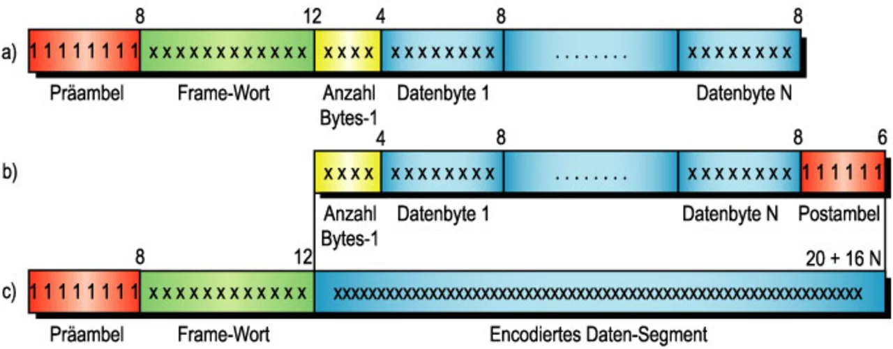 Das Frame-Wort definiert die Position des Byte-Zählers und der Nutzdaten. Werden variable Frame-Worte eingesetzt, lassen sich prinzipiell verschiedene Gruppen von Sendesignalen unterscheiden. Das Frame-Wort kann somit als Kanal-Identifikation angesehen werden. Empfangene Datenpakete, welche nichtkompatible Frame-Worte aufweisen, werden vom Empfänger nicht weiterverarbeitet. Der nachfolgende Byte-Zähler von 4 bit Länge spezifiziert die Anzahl der nachfolgenden Nutzdaten in Bytes.