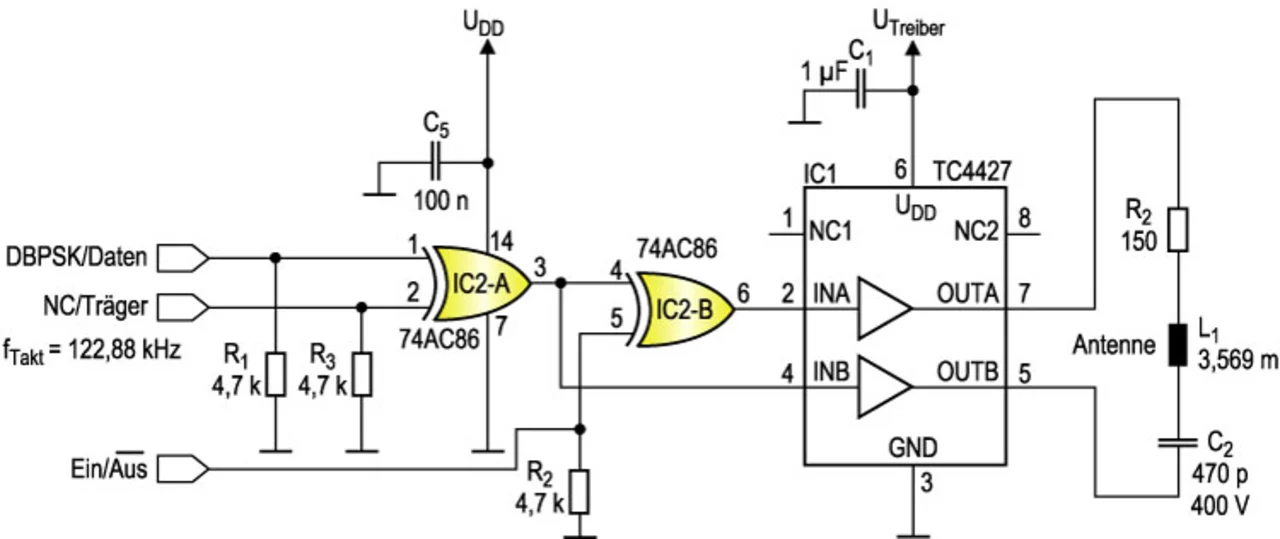 Der Sender lässt sich sehr einfach mit einem Mikrocontroller realisieren, ein solcher ist im Sendesystem meistens schon vorhanden. Der Sender wird mit einfachsten Mitteln aufgebaut: eine Treiberstufe und eine Antenne (Bild 4). Die dafür notwendige Software ist anspruchslos und als C-Code verfügbar. Der Controller muss die Trägerfrequenz und das Datensignal generieren. Die Phasendrehung kann zum Beispiel mit einem „Exclusive Or“-Gatter realisiert werden. Eine mögliche Variante zeigt Bild 5.