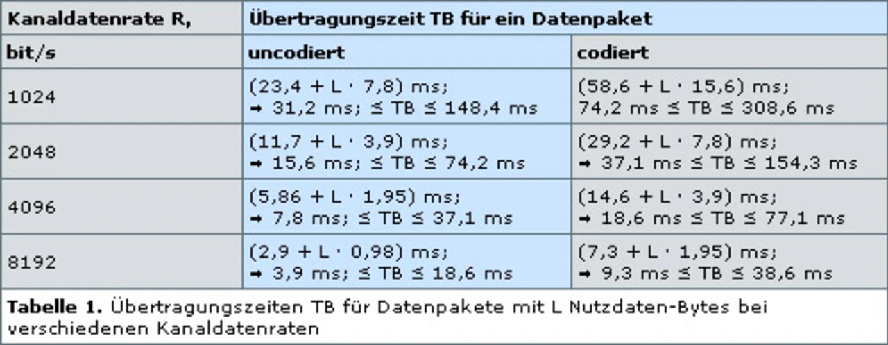 Die Daten werden mit differentieller Phasenumtastung DBPSK (Differential Binary Phase Shift Keying) übertragen, wobei Trägerfrequenzen von fc = (8192 + n x 16 384) Hz mit 0 ≤ n ≤ 7 und Kanaldatenraten von {1024, 2048, 4096, 8192} bit/s möglich sind. Die Übertragungszeiten bei verschiedenen Kanaldatenraten und Anzahl der Nutzdaten-Bytes sind in Tabelle 1 zusammengefasst.