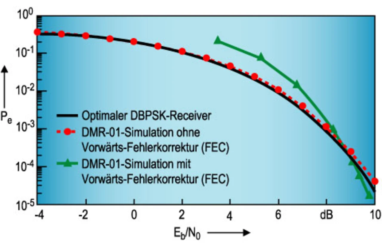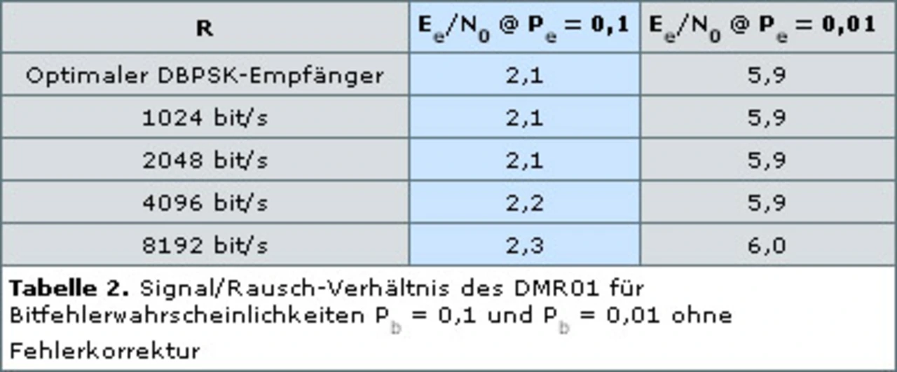 Das mit 32,768 kHz abgetastete Empfangssignal wird vom Synchronisator und Bit-Estimator demoduliert, also zu einer geschätzten Version der gesendeten Datensequenz verarbeitet. Synchronisator und Bit-Estimator verwenden „Maximum Likelihood“-Schätzmethoden, sie weisen eine extrem hohe Güte auf. In Bild 3 wird ein optimaler DBPSK-Empfänger verglichen mit den Resultaten aus der Simulation der DMR01-Stufen – A/D-Wandler und Synchronisator und Bit-Estimator – für den uncodierten Fall und bei Verwendung des Faltungscodes. Dabei ist die Bitfehlerwahrscheinlichkeit Pe als Funktion des Signal/Rausch-Abstandes Eb/N0 dargestellt. Eb bezeichnet im uncodierten sowie im codierten Fall die Energie, mit der ein Quelldatenbit übertragen wird – N0 ist die einseitige spektrale Rauschleistungsdichte. Da im codierten Fall zwei Bit pro Quelldaten-Bit gesendet werden, halbiert sich die Signalenergie pro Kanaldaten-Bit (–3dB) gegenüber der uncodierten Übertragung. Bei einer Bitfehlerwahrscheinlichkeit von Pe = 0,1 und der maximalen Datenrate von 8,192 kbit/s (Tabelle 2) beträgt die maximale Abweichung gegenüber dem theoretisch optimalen Empfänger 0,2 dB, was gleichbedeutend ist mit einem Verlust an empfangener Signalleistung von 4,5 Prozent.