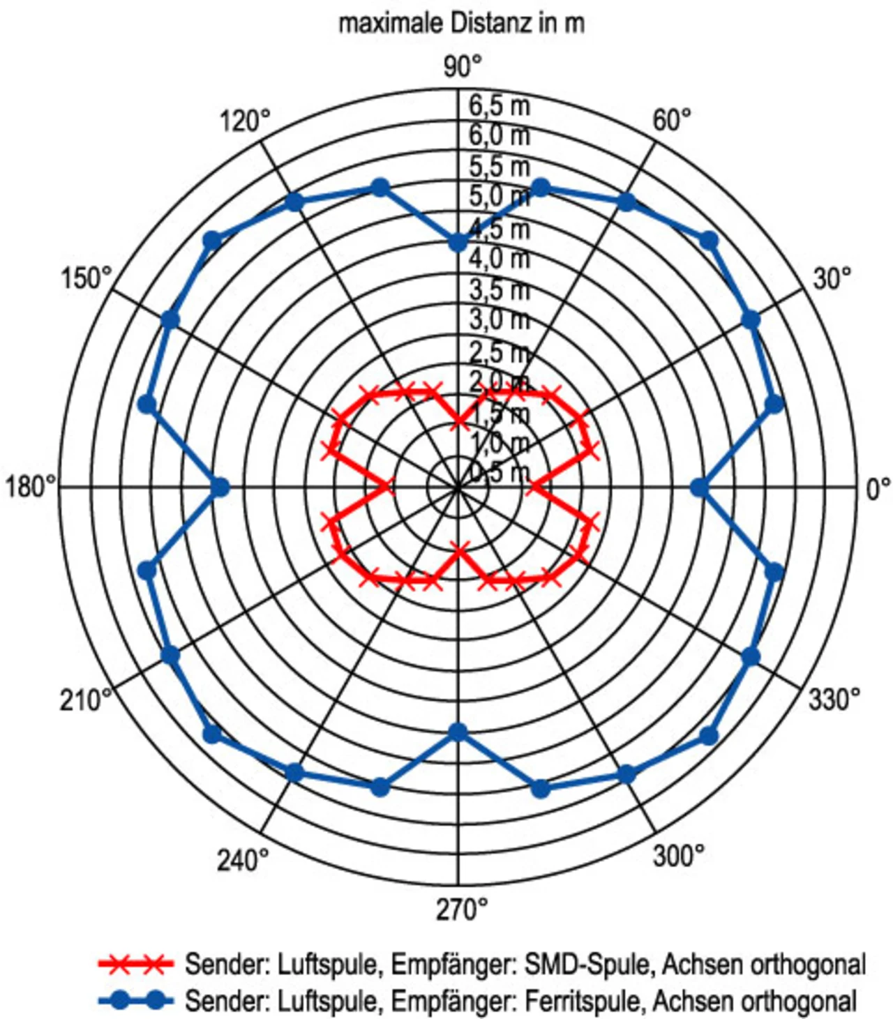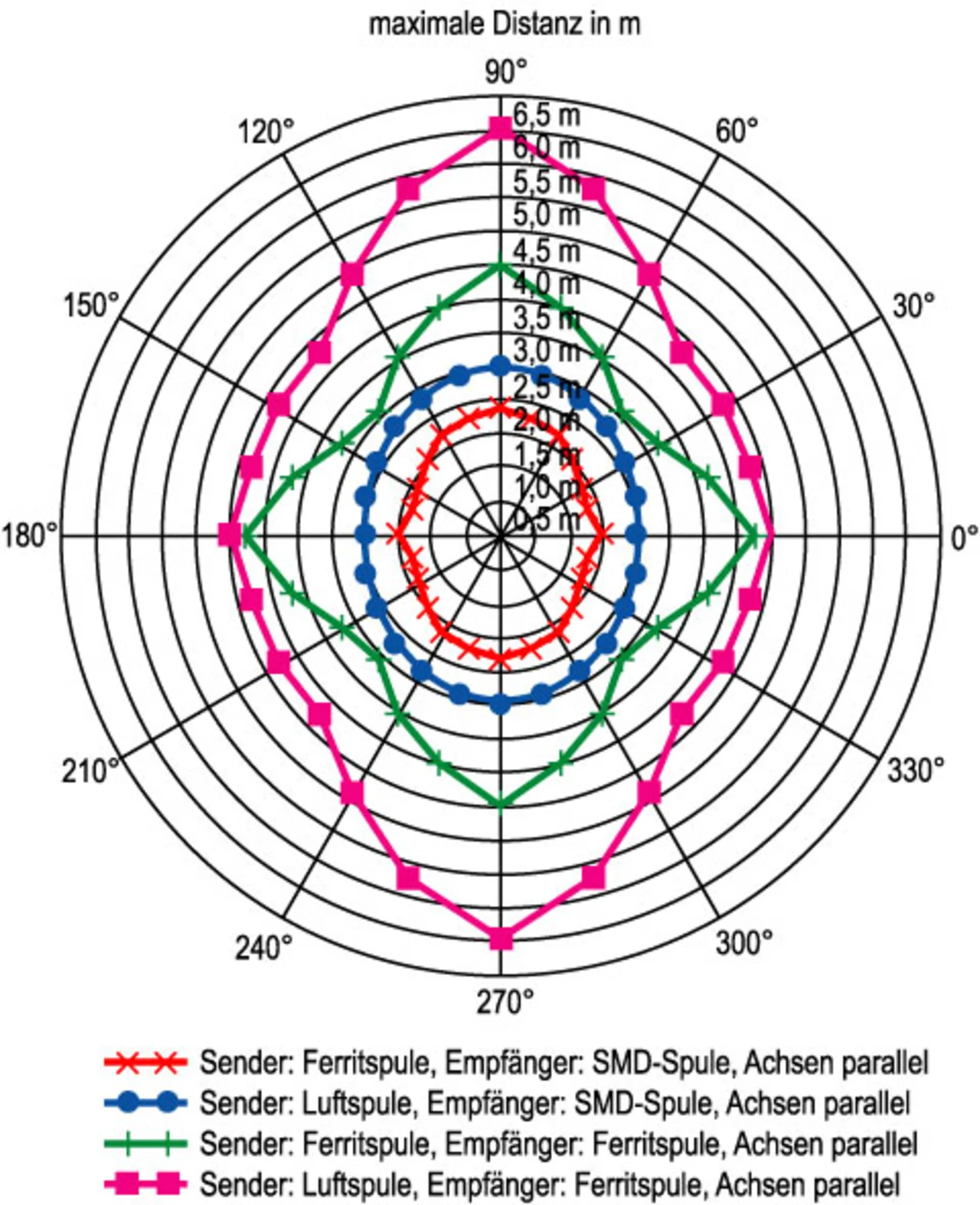 Die Reichweite und der Empfangsbereich können durch ein geeignetes Antennendesign wesentlich beeinflusst werden. Über Größe und Art der Antennen (Luft- und Ferritspulen) und mit der Auslegung des Vorverstär-kers lässt sich der Empfangsbereich „maßschneidern“. Bild 7 illustriert einige unterschiedliche Empfangsbereiche. Sender- und Empfängerspule und die Lage der Antennen wurden verändert, während der Vorverstärker des Empfängers immer gleich belassen wurde. Mit Hilfe geeigneter Antennen können also Störungen vermieden oder die Empfangsenergie an bestimmten Orten gebündelt werden.