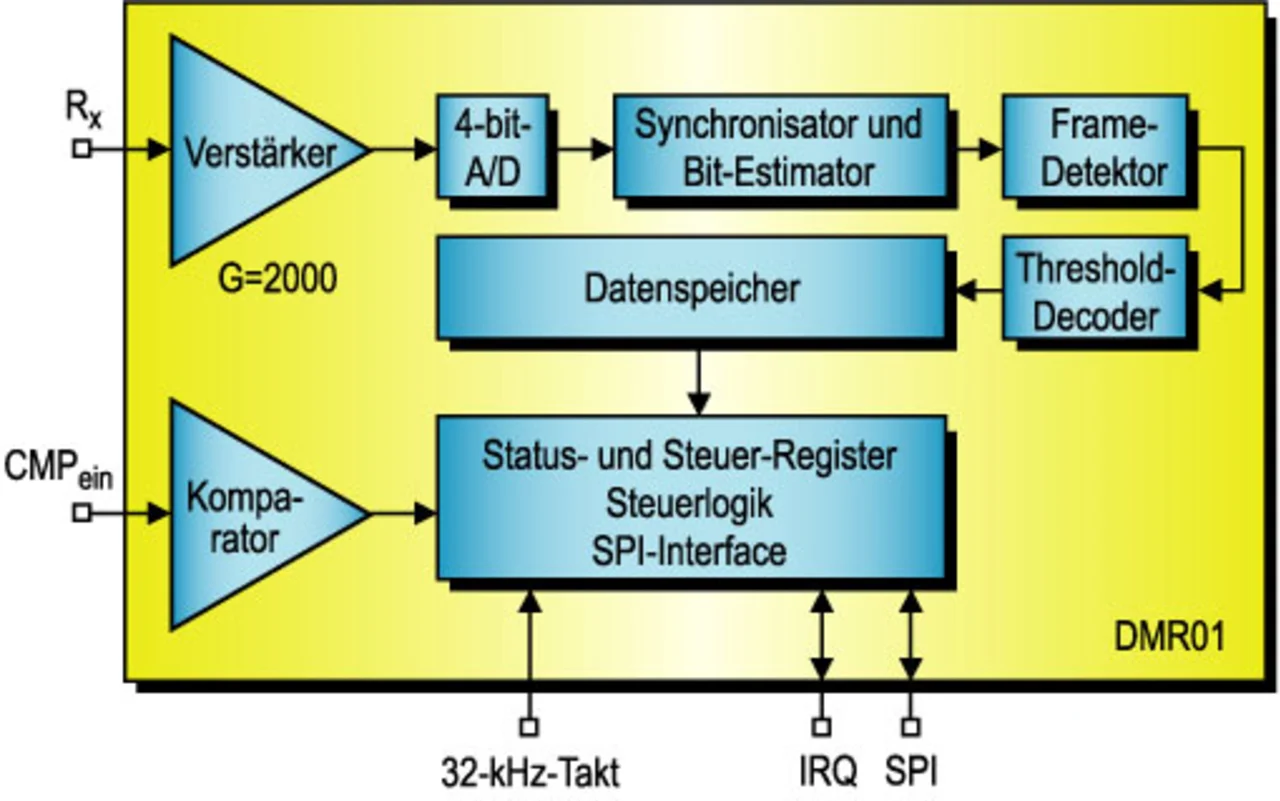 Der DMR01 ist ein „Single Chip“-Empfänger für den Empfang asynchroner Datenpakete nach den beschriebenen Spezifikationen bezüglich Datenformat und Modulation. Das Antennensignal wird direkt oder über eine Vorverstärkerstufe auf den Eingang Rx geschaltet. Das Signal wird verstärkt und auf den Eingang eines 4-bit-A/D-Wandlers geführt. Verstärkung, Bandbreite und Eingangsspannungsbereich des A/D-Wandlers sind programmierbar; so lässt sich das Signal optimal für die Wandlung anpassen (Bild 2).