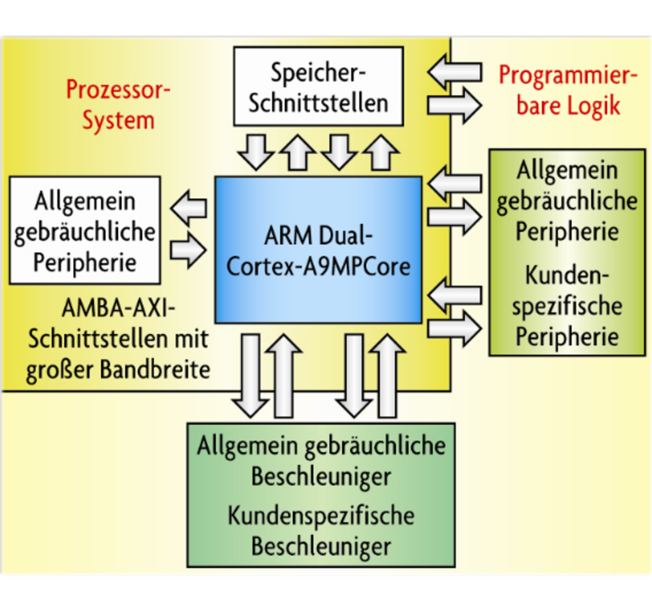 Das Erweitern des Prozessorsystems erfordert eine enge Kopplung mit der programmierbaren Logik, um eine nahtlose Schnittstelle mit hoher Leistungsfähigkeit, einfacher Konfiguration und leichter Programmierung sicherzustellen. Diese Erweiterung wird ermöglicht durch den Einsatz von AMBA-AXI-Verbindungen mit hoher Bandbreite zwischen dem Prozessorsystem und der programmierbaren Logik, die Steuerungs-, Datenverarbeitungs-, I/O- und Speicheraufgaben übernimmt. Dies bietet nicht nur die Möglichkeit, sehr große Datenmengen mit sehr geringer Verlustleistung zu übertragen, sondern vereinheitlicht auch die beiden Bereiche Hardware- und Software-Programmierung.