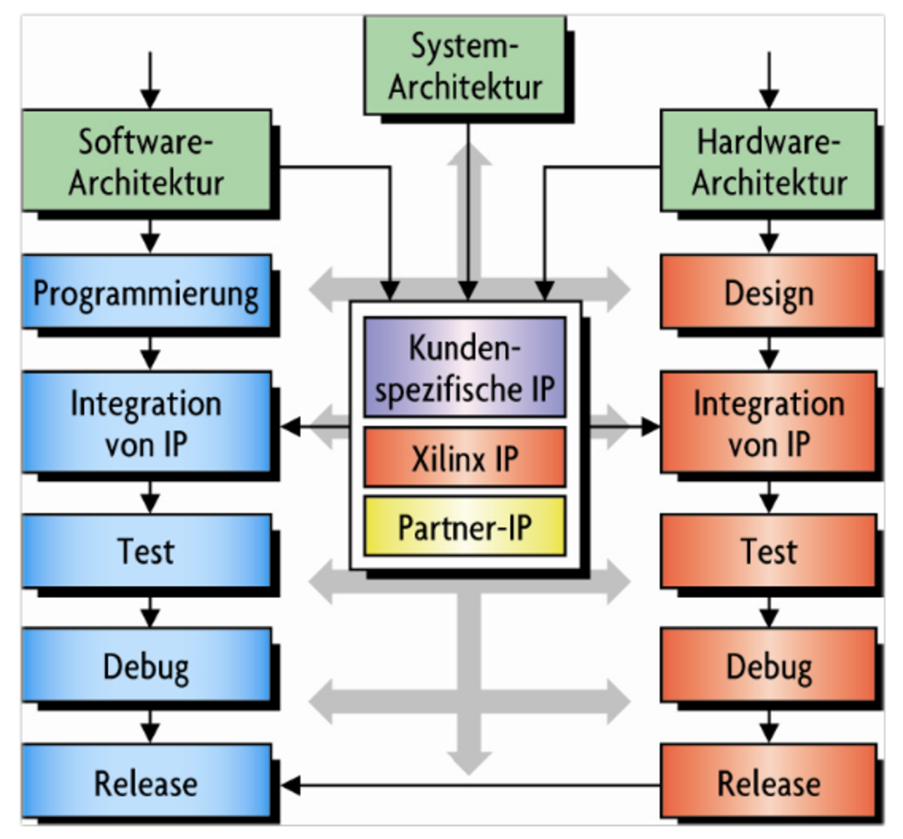 Programmierbare Logikbausteine wie z.B. die FPGAs von Xilinx, werden von fortschrittlichen Entwicklungswerkzeugen unterstützt. In diesen Entwicklungsumgebungen sind die Programmiersprachen hardware-orientiert wie z.B. Verilog und VHDL. Software-Entwickler arbeiten meist exklusiv mit Hochsprachen wie C/C++, die ebenfalls von den heutigen prozessor-basierenden Lösungen unterstützt werden. In der Extensible-Processing-Platform ermöglicht Xilinx Unterstützung für populäre Software-Entwicklungs- und Debugging-Umgebungen wie u.a. ARM Real View und Werkzeuge von Fremdanbietern, auf Eclipse basierende IDEs, GNU oder Xilinx-Software-Entwicklungs-Kit. Der programmierbare Logikteil kann mit der Standardentwicklungsumgebung ISE oder den HDL- und algorithmischen Entwicklungswerkzeugen von Drittanbietern entwickelt und von Fehlern befreit werden.