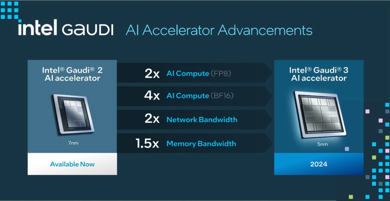 Der KI-Beschleuniger Gaudi 3 (5 nm) baut auf Gaudi 2 (7 nm) auf, kommt aber auf eine deutlich höhere Rechenleistung.