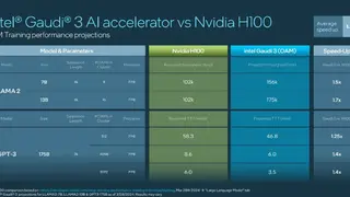Um die hohe Leistungsfähigkeit von Gaudi 3 zu zeigen, hat sich Intel zu einem Vergleich mit Nvidia entschieden. Dazu muss allerdings gesagt werden, dass die Intel-Werte lediglich hauseigene Prognosen sind, da ja noch kein echtes Silizium vorliegt. Aber die prognostizierten Werte dürften Nvidia zumindest zum Teil aufhorchen lassen: