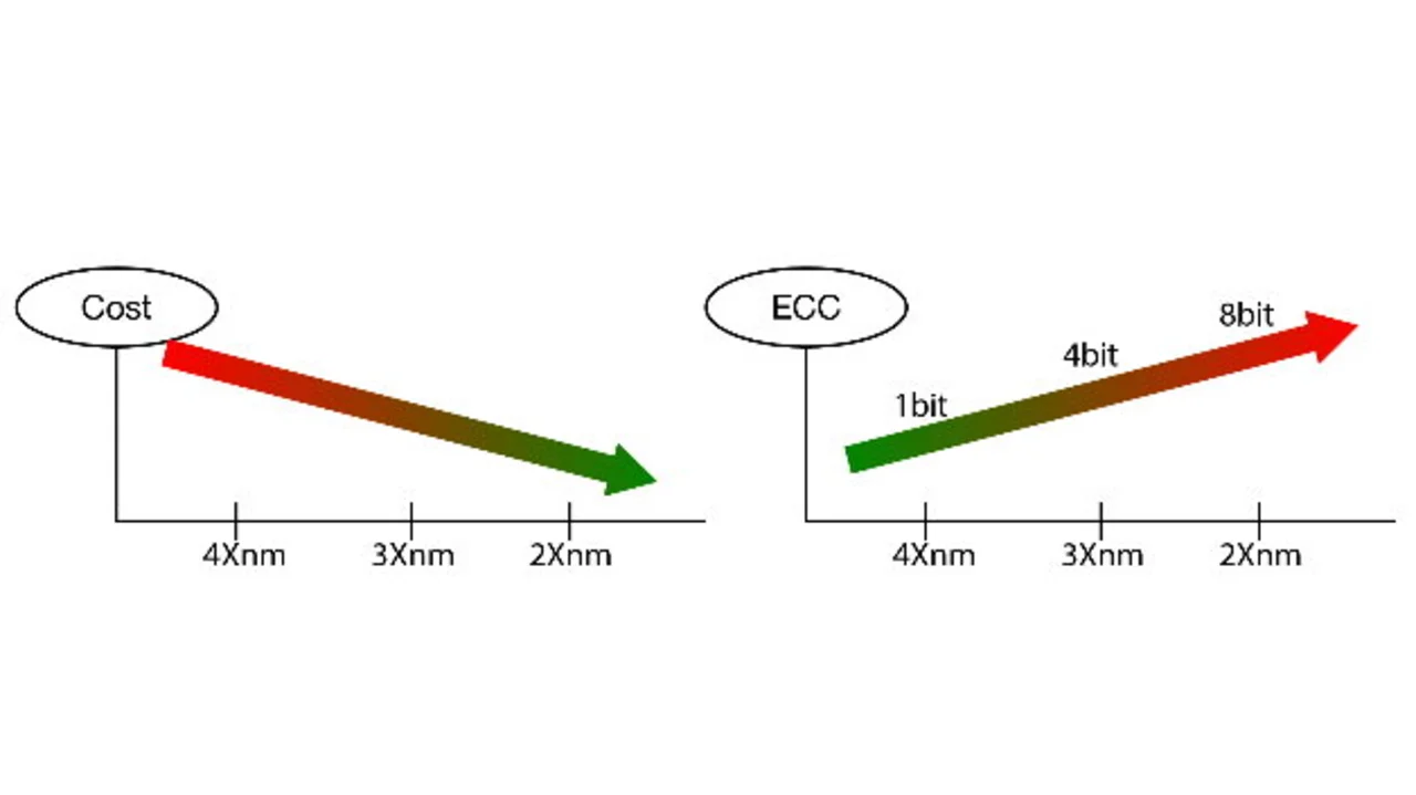 SLC-NAND-Flash-Speicher, die in 43-nm-Prozessen gefertigt werden, benötigen eine 1-Bit-ECC für Speicherdichten bis 4 GBit. Ein 1-Bit-ECC-Algorithmus korrigiert ein Fehlerbit pro 512 Byte. Bei kleineren Prozesstechnologien ist eine zunehmend komplexe Fehlerkorrektur erforderlich: eine 4-Bit-ECC für 512 Byte bei Sub-40-nm-SLC-NAND und eine 8-Bit-ECC für Speicher, die in 24 nm gefertigt werden.