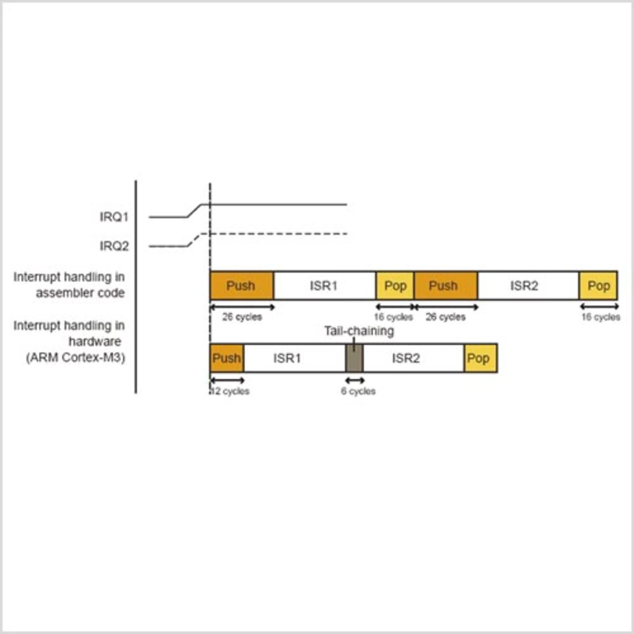 Mithilfe des Hardware-Interrupts sichert die Hardware die Statusregister beim Start der Interruptroutine. Beim »Tail- Chaining« überprüft der Cortex-M3, ob noch Interrupts anstehen, bevor er die Routine mit Rückschreiben der Statusregister beendet. Dies verhindert Pop-and- Push-Operationen (Bild 2). Aus diesem Grund benötigt die MCU nicht mehr als sechs Zyklen, um zu einem noch ausstehenden Interrupt zu wechseln.