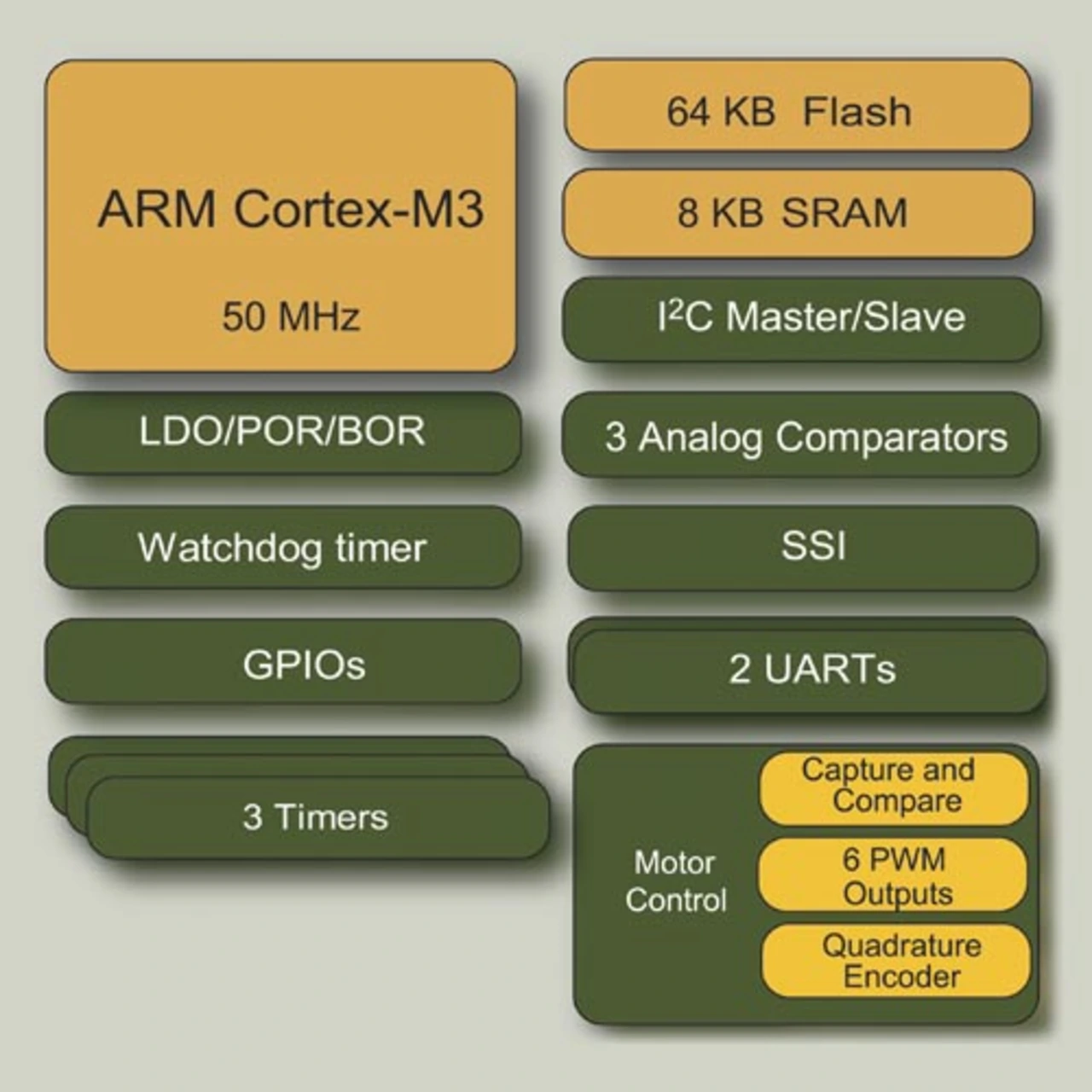 Die »Stellaris«-Familie von Luminary Micro ist für den universellen Einsatz für ein breites Spektrum von Applikation konzipiert, bei denen es auf einfache Integration und Handling sowie hohe Rechenleistung bei niedrigen Preisen ankommt. Deshalb sind auch viele Standardschnittstellen integriert, beispielsweise UART, SPI, I2C sowie ausreichend On-Chip- Flash und -SRAM (Bild 3). Für eine Applikation eignet sich die Stellaris-Familie aber besonders: Im Bereich Motorsteuerungen punkten diese Controller durch spezielle PWM-Module. Diese sind in der Lage, mit 16 Bit aufzulösen, Halb- und Vollbrücken mit Totzeitgenerierung und Not-Aus anzusteuern und die On-Chip-ADCs (Analog/Digital-Wandler) zu speziellen Ereignissen zu triggern und zu synchronisieren, was das Handling mit Inkrementalgebern stark vereinfacht. Kommt es auf dabei zusätzlich auf hohe Auflösungen und komfortable Ansteuerung an, leistet die bei einigen Typen integrierte Quadratur-Encoderschnittstelle gut Dienste.