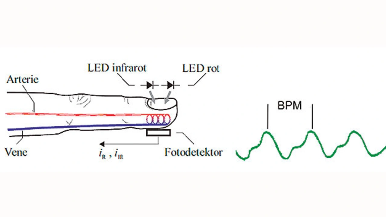 Neben dem Puls wird von den üblichen PPG-Messgeräten der Sauerstoffgehalt im Blut nach dem Verfahren der Pulsoximetrie [1] gemessen, wofür mindestens zwei Lichtquellen mit unterschiedlichen Spektren (Spektrophotometrie) eingesetzt werden. Üblicherweise sind dies zwei Leuchtdioden mit Rotlicht bei ungefähr 660 nm und Infrarotlicht bei ungefähr 940 nm. Ein Fotodetektor, der diesen LEDs gegenüber auf der anderen Seite des arteriellen Gefäßbetts platziert ist, misst die Intensität des durchscheinenden Lichts (Bild 2).