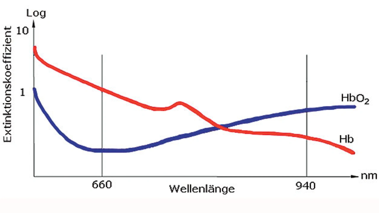 Die unterschiedlichen Lichtintensitäten, die auf den Fotodetektor treffen, werden durch unterschiedliche Lichtabsorptionen beeinflusst (html" title="https://www.elektroniknet.de/halbleiter/elektronik-zum-erfassen-von-vitalparametern.184647/bild-781294.3.html">Bild 3). Diese ergeben sich aus dem mit Sauerstoff gesättigten (oxigeniert, HbO2) und dem gesamten Hämoglobin (Protein der roten Blutkörperchen, Hb, das fähig ist Sauerstoff zu binden – desoxigeniert).