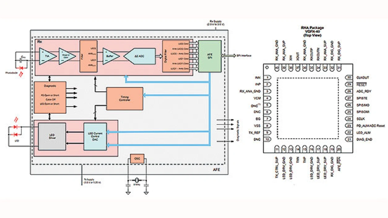 Der ebenfalls integrierte Analog-Digital-Umsetzer arbeitet nach dem Prinzip eines Delta-Sigma-Modulators mit einer Auflösung von 22 bit und liefert die Daten an ein digitales Filter. Als Ausgang dient eine SPI-Schnittstelle. Neben den maximal zwei LEDs und der Fotodiode sind an den AFE4490 extern nur noch ein Quarz (8 MHz) sowie acht Kondensatoren anzuschließen (html" title="https://www.elektroniknet.de/halbleiter/elektronik-zum-erfassen-von-vitalparametern.184647/bild-781294.4.html">Bild 4).