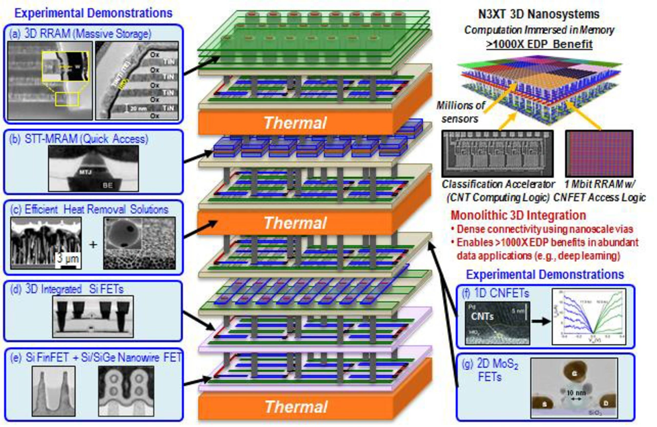 Jenseits der Transistorstrukturen versprechen 3D-Chips mit feinkörniger monolithischer 3D-Integration mit ultradichten Datenübertragungskanälen ebenfalls Verbesserungen bis zum Faktor 1000 beim Energy-Delay-Produkt. Ein Beispiel dafür ist die Nano-Engineered Computing-Systems Technologiekonzept (N3XT). Die Schlüsselelemente für N3XT sind Logik und Speicher die sich bei niedrigen BEOL-kompatiblen Temperaturen (Back End of Line) in dünnen Schichten herstellen lassen und die die Formung von ultra-dichten Vias zwischen den Lagen zulassen. Beispiele dafür sind die EU-Projekte e-BRAINS und e-CUBES, bei denen es sich um vollständige IoT-Sensorknoten mit integriertem Fog-Computing handelt.