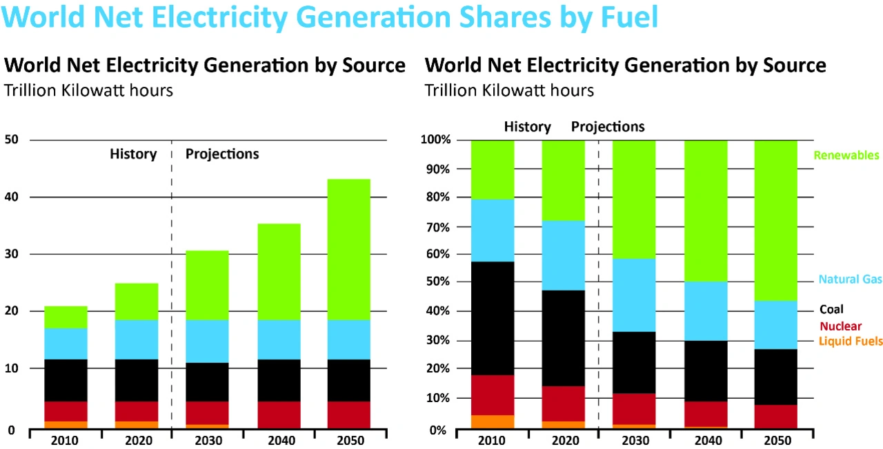 Das Bevölkerungswachstum, die zunehmende E-Mobilität, die Anforderungen der Industrieautomatisierung, die gestiegenen Anforderungen an die Datenverarbeitung im Hyperscale-Format sowie die Verbreitung intelligenter, batteriebetriebener IoT-Geräte erhöhen den Stromverbrauch dramatisch. Wenn fossile Brennstoffe die einzige Energiequelle sind, die zur Deckung dieser steigenden Nachfrage verwendet wird, würde die daraus resultierende höhere Menge an Treibhausgasemissionen die bereits sichtbaren Auswirkungen des Klimawandels noch verschärfen. Daher ist es zwingend erforderlich, dass erneuerbare Energiequellen einen größeren Anteil des steigenden Strombedarf decken als fossile Brennstoffe. Laut Bild 1 (eia International Energy Outlook 2021, www.eia.gov/ieo) wird die weltweite Nettostromerzeugung zwischen 2020 und 2050 voraussichtlich von 25 Billionen auf etwa 40 Billionen kWh steigen. Der Anteil der Elektrizität aus erneuerbaren Energiequellen, vor allem aus Wind- und Sonnenenergie, wird im gleichen Zeitraum von etwa 30 auf 65% steigen.