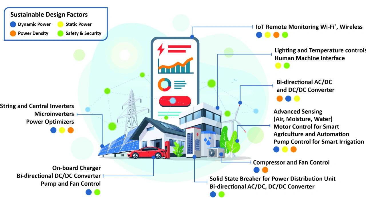 Eine wichtige Eigenschaft von Halbleitern in nachhaltigen Designs ist ein geringer Stromverbrauch. Bei batteriebetriebenen, intelligenten/smarten Geräten, die für nachhaltige Ökosysteme charakteristisch sind, verlängert ein niedriger Stromverbrauch die Batterielebensdauer, was sich in längeren Betriebszeiten zwischen den Ladezyklen niederschlägt und somit Energie spart. Bei Hochleistungs-DC/DC- und AC/DC-Wandlern in Anwendungen für erneuerbare Energien führt ein geringerer Stromverbrauch zu einer höheren Systemeffizienz, die eine größere Parität zwischen der erzeugten und der an eine elektronische Last gelieferten Leistung aufweist.