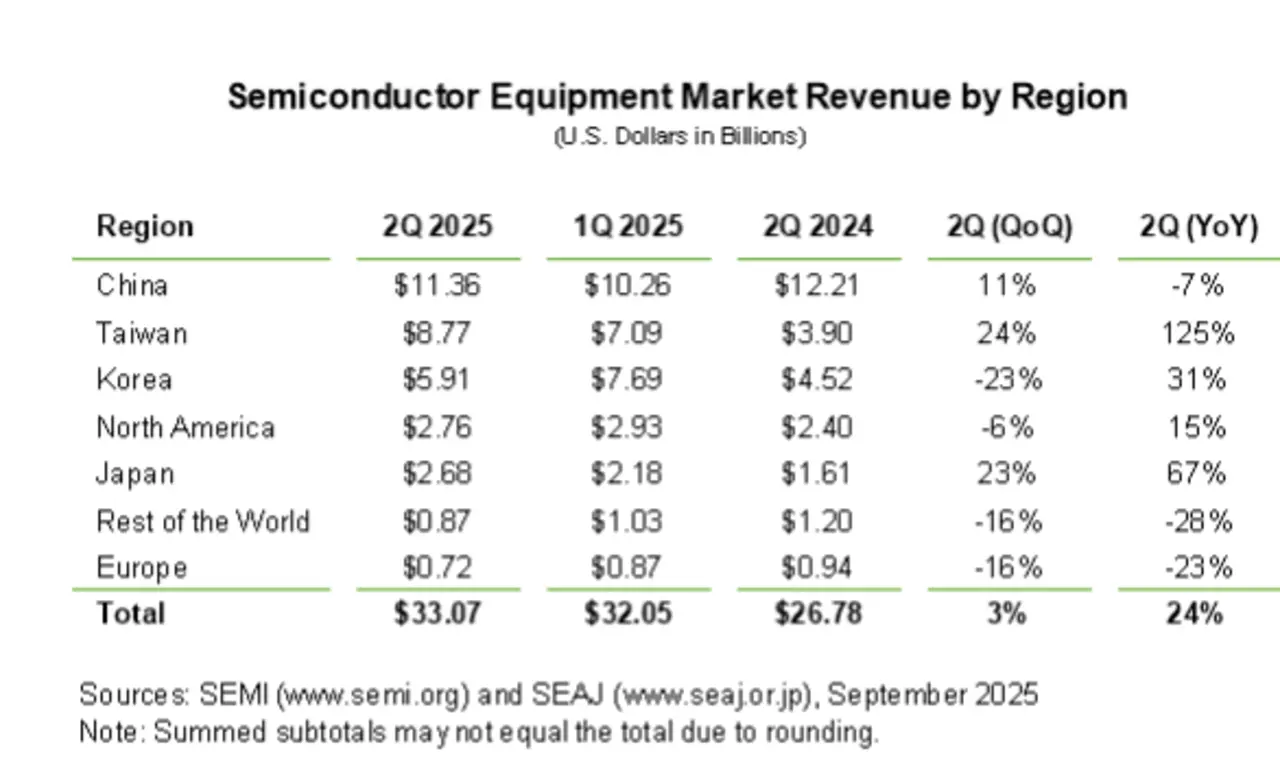Um 24 Prozent auf 33 Mrd. Dollar ist der Umsatz mit Maschinen für die Halbleiterfertigung im zweiten Quartal 2025 nach Angaben der SEMI gestiegen, im ersten Halbjahr erreichte er 65 Mrd. Dollar.