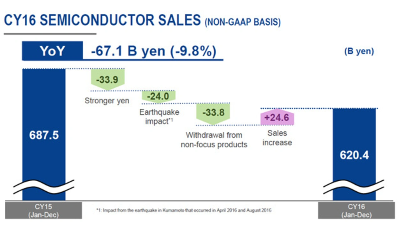 Für den deutlichen Umsatzrückgang nennt Renesas drei Gründe: der starke Yen, die Erdbeben im Bereich der japanischen Präfektur Kumamoto im April und August letzten Jahres, von denen die Halbleiterfertigung im Werk in Kawashiri beeinträchtigt wurde, und der Rückzug aus der Fertigung von Produkten, die außerhalb des Schwerpunktes liegen (Bild 1). Das Erdbeben am 14. April 2016 führte zu einer mehrtägigen Unterbrechung der Produktion. Erst am 22. April 2016 konnte das Werk in Kawashiri wieder starten und es dauerte einen Monat bis die alte Produktionskapazität erreicht wurde. Das Erdbeben am 31. August 2016 hatte geringere Auswirkungen und bereits am 2. September 2016 lief die Produktion wieder mit der Kapazität, die vor dem Erdbeben erreicht wurde. Zwar gibt Renesas an, im abgelaufenen Geschäftsjahr 2016 mehr Produkte verkauft zu haben, schränkt jedoch ein, dass es sich vorrangig um Halbleiter mit niedriger Marge handelte, so dass damit der Umsatzrückgang nur wenig kompensiert werden konnte.