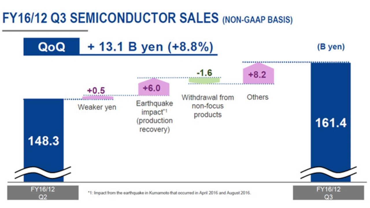 Mit dem Geschäftsjahr 2016 passt Renesas Electronics seinen Bilanzzeitraum ans Kalenderjahr an. Statt zum 31. März enden die Geschäftsjahre von 2016 an zukünftig synchron zum Kalenderjahr am 31. Dezember. Dadurch wird ein Vergleich der Zahlen des Geschäftsjahrs 2016 zum Vorjahr schwierig. Renesas hat deshalb sowohl den Vorjahreszeitraum (April bis Dezember) als Vergleichsbasis genommen, als auch Quartalszahlen zu Kalenderjahresergebnissen zusammengefasst, um einen Vergleich zu ermöglichen. In beiden Fällen errechnet sich für das gerade abgeschlossene Geschäftsjahr ein Rückgang des Nettoumsatzes um rund 10 Prozent. In Euro zum aktuellen Wechselkurs umgerechnet betrug der Nettoumsatz in den neun Monaten des Geschäftsjahres 2016 3,93 Mrd. Euro. 3,81 Mrd. Euro wurden mit Halbleitern erwirtschaftet, zu 51 Prozent mit der Automobilindustrie und zu 49 Prozent mit anderen Branchen. Das operative Ergebnis ging um 37,9 Prozent auf 456 Mio. Euro zurück und der Gewinn sank auf 368 Mio. Euro um 41,9 Prozent, beides gegenüber dem gleichen Vorjahreszeitraum.