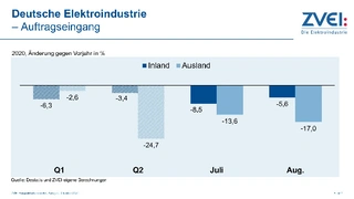 Die Anzeichen verdichten sich, dass der Weg zum Vorkrisenniveau ein längerer sein wird, berichtet der ZVEI in Frankfurt am Main. Im August 2020 verzeichnete die deutsche Elektroindustrie im Vergleich zum Vorjahr 12,4 Prozent weniger Bestellungen. Die Inlandsorders gingen um 5,6 Prozent und die Auslandsaufträge um 17,0 Prozent zurück. »Wir steuern auf eine langsamere, U-förmige Erholung hin, statt der erhofften schnellen, V-förmigen«, erklärt ZVEI-Konjunkturexperte Peter Giehl. Zumal der Rückgang höher ausfiel als im Juni (-1,1 %) und Juli (-11,3 %). Im Gesamtzeitraum von Januar bis August dieses Jahres verfehlten die Auftragseingänge ihren entsprechenden Vorjahreswert um 10,3 Prozent.