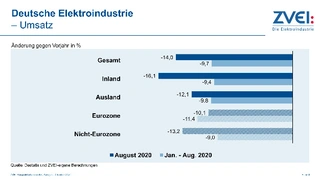 Der von Januar bis August aggregierte Branchenumsatz belief sich auf 112,8 Mrd. Euro, womit er um 9,7 Prozent niedriger lag als vor einem Jahr. Die Inlandserlöse büßten um 9,4 Prozent auf 53,3 Mrd. Euro ein, die Auslandserlöse um 9,8 Prozent auf 59,5 Mrd. Euro. Der Umsatz mit der Eurozone verfehlte sein Vorjahresniveau um mehr als ein Zehntel (-11,4 % auf 21,7 Mrd. €). Mit Drittländern kam es zu einem Minus von 9,0 Prozent auf 37,8 Mrd. Euro.