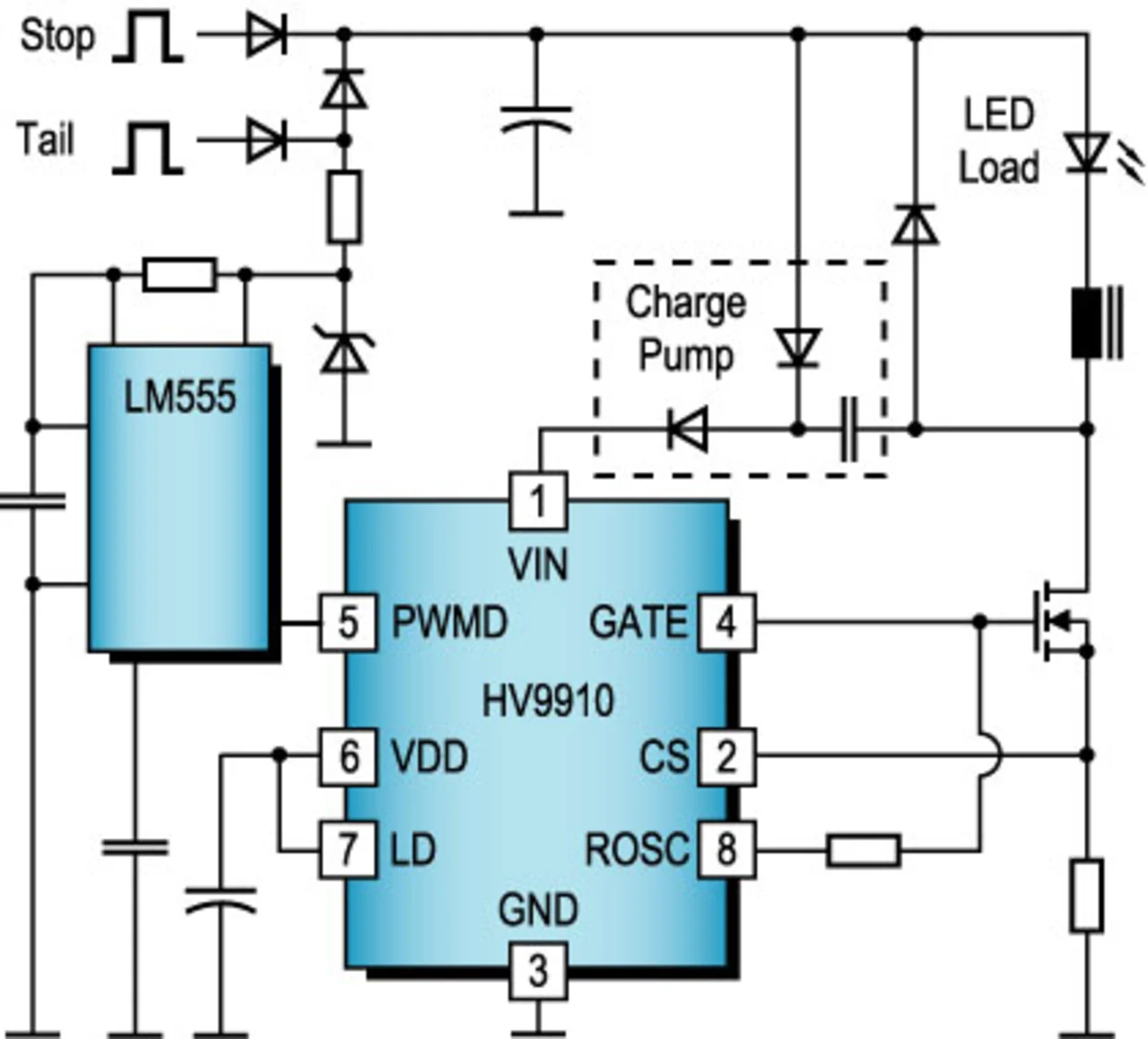 Das Timer-IC LM555 ist als astabiler Multivibrator konfiguriert, um das Tastverhältnis beim Betrieb als Rücklicht zu verringern. Sein niederfrequentes PWM-Signal moduliert das Schalten des HV9910 über den PWMD-Eingang. Ein entsprechend gro-ßer Puffer-Kondensator ist in diesem Fall am VDD-Pin vorzusehen, um einen kontinuierlichen Betrieb des HV9910 auch bei Eingangsspannungen unter 8 V sicherzustellen.