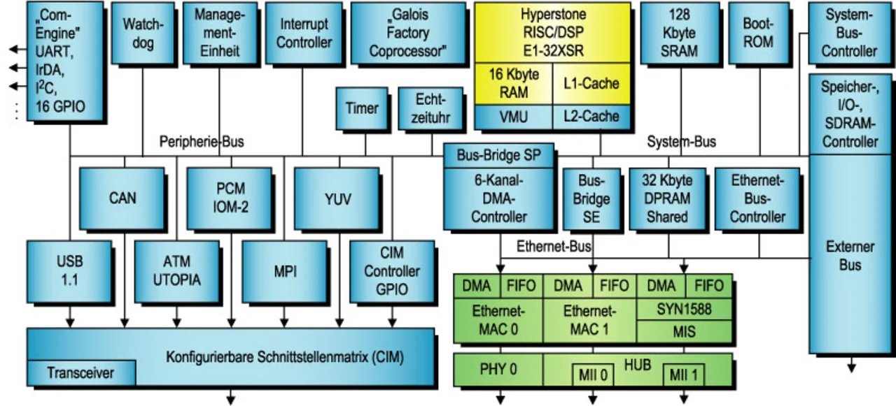 Um die hohen Kosten von Ethernet-Schnittstellen in den Griff zu bekommen, bieten sich als einzige Lösung hochintegrierte SoCs (System on Chip) an, z.B. der hyNet32XS von Hyperstone. Dieser Embedded Netzwerkprozessor zeichnet sich durch eine Vielfalt an Schnittstellen aus, aber auch durch die Erfüllung harter Echtzeit-Anforderungen. Es handelt sich bei ihm zudem um den ersten Baustein, der mit einem integrierten Ethernet-Transceiver (PHY) auf den Markt kam.