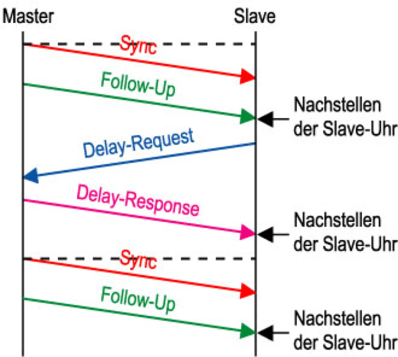 Das Prinzip des Precision Time Protocol (Bild 2): In einer ersten Phase wird die Zeitdifferenz zwischen dem Takt-Master und dem Takt-Slave korrigiert. Hierzu sendet der Takt-Master zyklisch ein „Sync“-Telegramm mit seiner aktuellen Uhrzeit auf den Bus. Während es verschickt wird, ermittelt die Hardware des Senders präzise die tatsächliche Sendezeit. Diese Zeit wird dann in einem so genannten „Follow-Up“-Telegramm verschickt. Der Empfänger übernimmt zunächst die Master-Zeit aus dem Sync-Telegramm, kann dann mit der Differenzzeit aus dem Follow-Up-Telegramm seine Uhr nachstellen und sich so präzise auf den Master synchronisieren. In einer zweiten Phase wird die Verzögerung auf der Übertragungsstrecke ermittelt. Hierzu sendet der Takt-Slave ein so genanntes „Delay-Request“-Telegramm zum Takt-Master, der mit einem „Delay-Response“-Telegramm antwortet. Dadurch kann der Takt-Slave auch noch die Zeitdifferenz korrigieren, die durch die Übertragungsstrecke (Ethernet-Kabel, Hubs, Switches) gegeben ist. Durch zyklisches Wiederholen von Sync- und Follow-Up-Telegrammen ist zudem gewährleistet, dass auch Abweichungen in der Quarzgenauigkeit der einzelnen Stationen immer wieder korrigiert werden. Der Master für alle Uhren ist stets der Teilnehmer, der die genaueste Uhr hat. Auch hier sorgt das Time Precision Protocol dafür, dass dieser automatisch ermittelt wird.