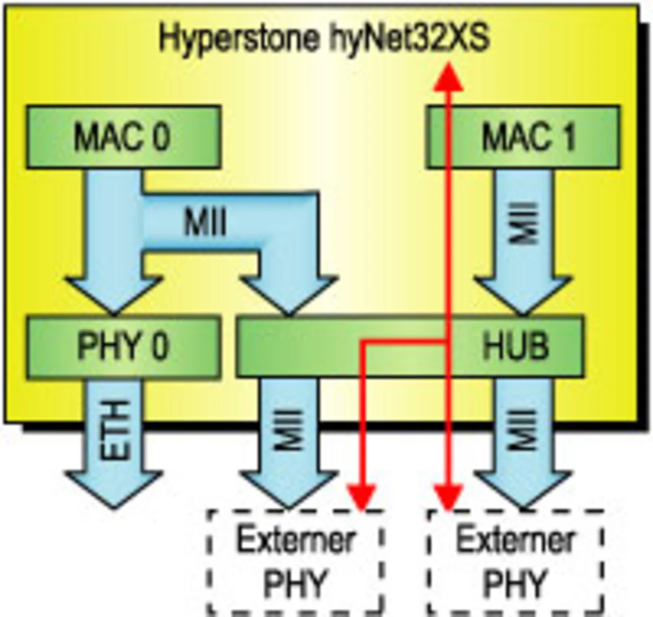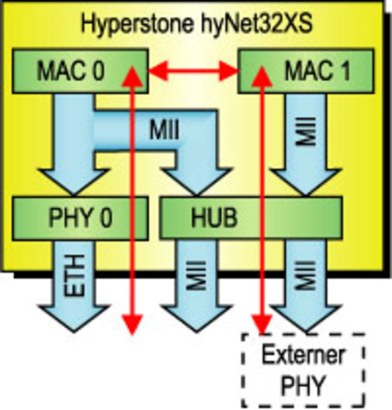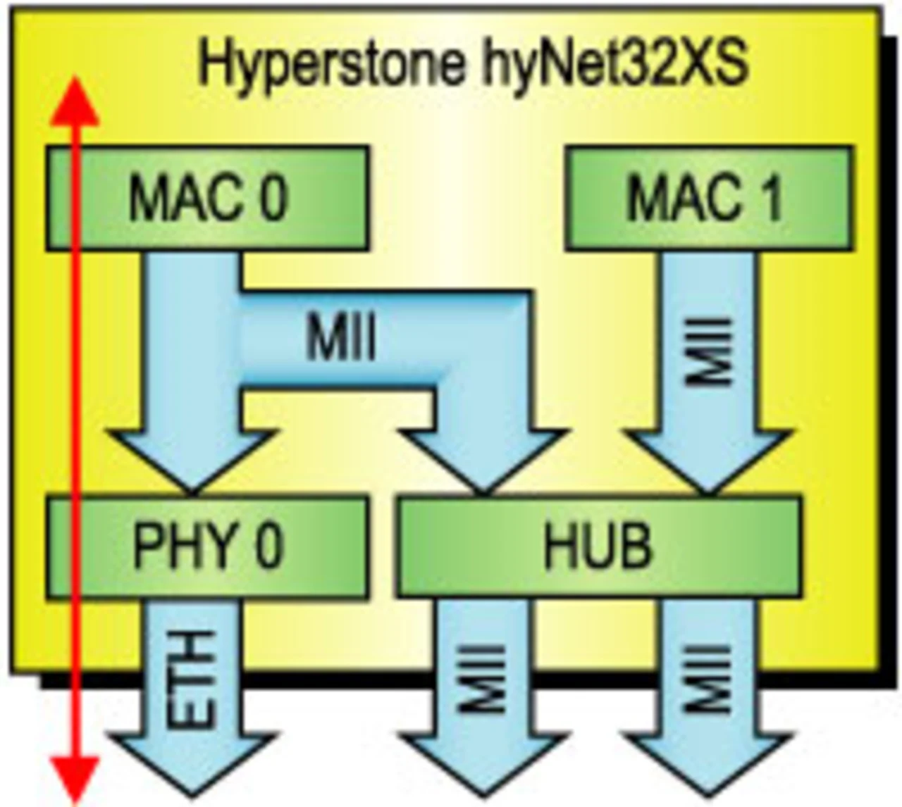 Ganz neu ist bei Hyperstone die flexible Konfiguration der zwei On-Chip-Ethernet-Schnittstellen des hyNet32XS, die sich nach Bedarf auch intern als Ethernet-Hub oder -Switch auslegen lassen. Das ist wichtig, um beispielsweise in der Industrieautomation bei langen Fertigungslinien eine aufwendige und teure Sternverkabelung zu vermeiden, wie sie im Bürobereich üblich ist. Durch die kostengünstige Integration eines Hub oder Switch direkt auf dem Chip können auch bei Ethernet benachbarte Feldgeräte direkt miteinander verbunden werden (Daisy-Chain, Linienverkabelung), was eine Sternverkabelung überflüssig macht.