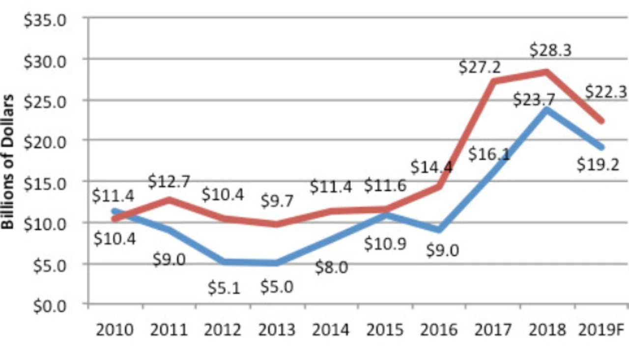 Weil aber Samsung, SK Hynix und Micron die Kapazitäten für DRAMs und NAND-Flash-ICs ausgebaut haben und Toshiba, Memory/Western Digital/SanDisk und XMC/Yangtze River Storage Technology ihre 3D-NAND-Flash-Linien deutlich hochgefahren haben, herrscht derzeit laut IC Insights Überkapazität und die Preise fallen. Die Preise pro Bit sind für DRAMs wie auch für NAND-Flash-ICs deutlich zurückgegangen und das hat zur Folge, dass die Hersteller ihre Investitionen 2019 deutlich kürzen: Die DRAM-Hersteller um 19 Prozent und die NAND-Flash-IC-Hersteller um 21 Prozent. Insgesamt werden die Hersteller von Speicher-ICs 2019 voraussichtlich 41,6 Mrd. Dollar ausgeben, also 10,4 Mrd. Dollar weniger als 2018.