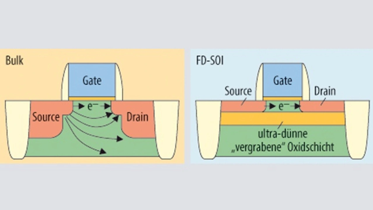 Mit FD-SOI bietet der Auftragsfertiger Globalfoundries eine Silizium-auf-Isolator-Technologie an, bei der eine sehr dünne Oxidschicht unterhalb des Transistors eingebracht ist (Bild 1). Eine Dotierung im Ladungsträgerkanal wird nicht benötigt. Da zusätzlich mit geringeren Versorgungsspannungen gearbeitet werden kann als bei Bulk-Silizium, ist auch die Leistungsaufnahme im aktiven Modus reduziert.