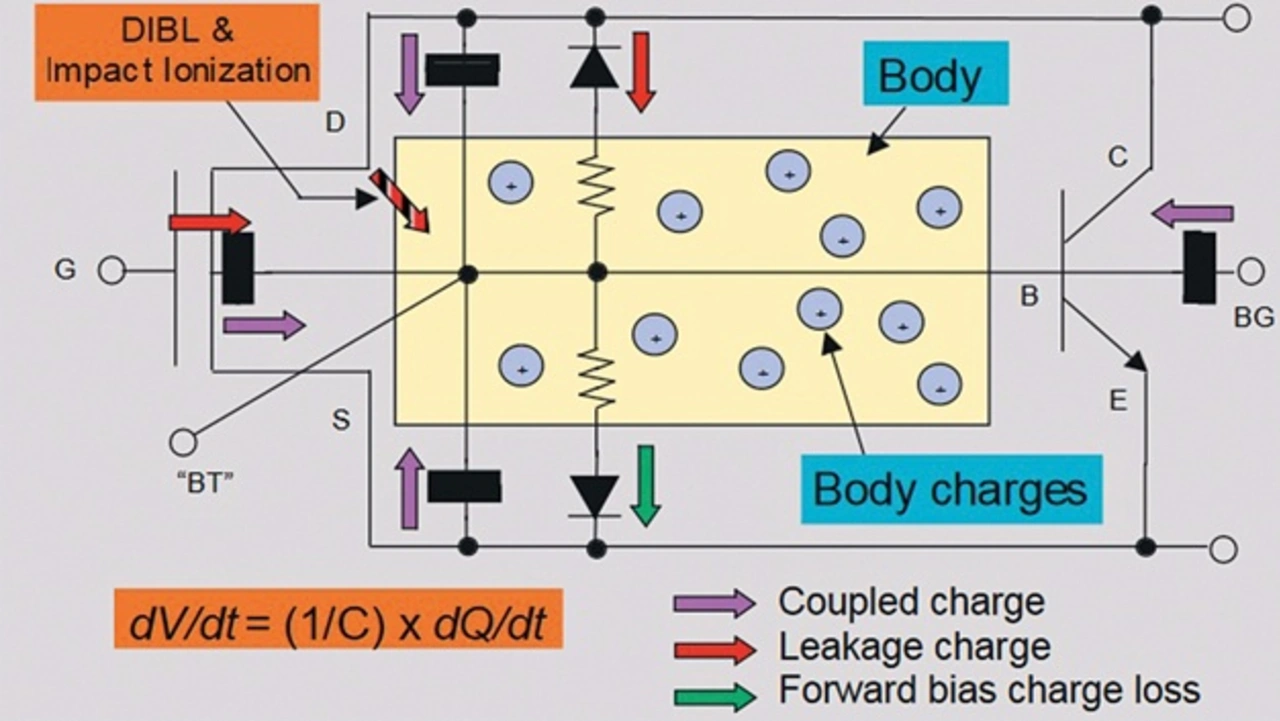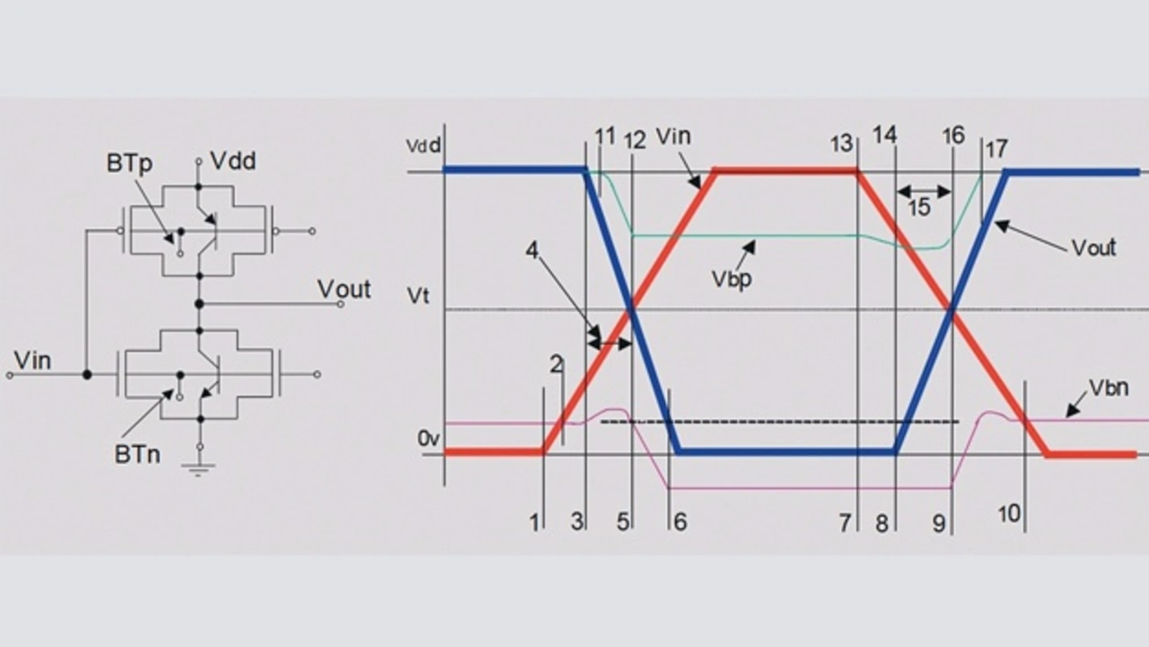 Allerdings kann damit bei PD-SOI-Transistoren der »Floating-Körper« über die Zeit Ladungen aufsummieren, wie es Bild 2 am Beispiel eines n-Kanal-Transistors zeigt. Die Konsequenz sind Variationen der Schwellenspannung (Bild 3 zeigt diese für einen Inverter mit n- und p-Kanal-Transistor), was das Chip-Design verkompliziert. Wie die Kurvenverläufe verdeutlichen (Bild 3), wird eine ideale Schaltfunktion mit senkrechten Flanken in der Praxis bekanntlich nicht erreicht, so dass es für den realen Schaltvorgang eine Rolle spielt, wie lange eine steigende oder fallende Flanke braucht, bis die Schwellenspannung erreicht ist. Idealerweise liegt diese genau in der Mitte zwischen Masse und Versorgungsspannung, doch wegen den in Bild 3 erkennbaren Ladungseffekten ist dies genau nicht der Fall. Die Zahlen von 1 bis 17 dokumentieren den zeitlichen Schaltverlauf in zwei Phasen, die in [2] genauer beschrieben sind: