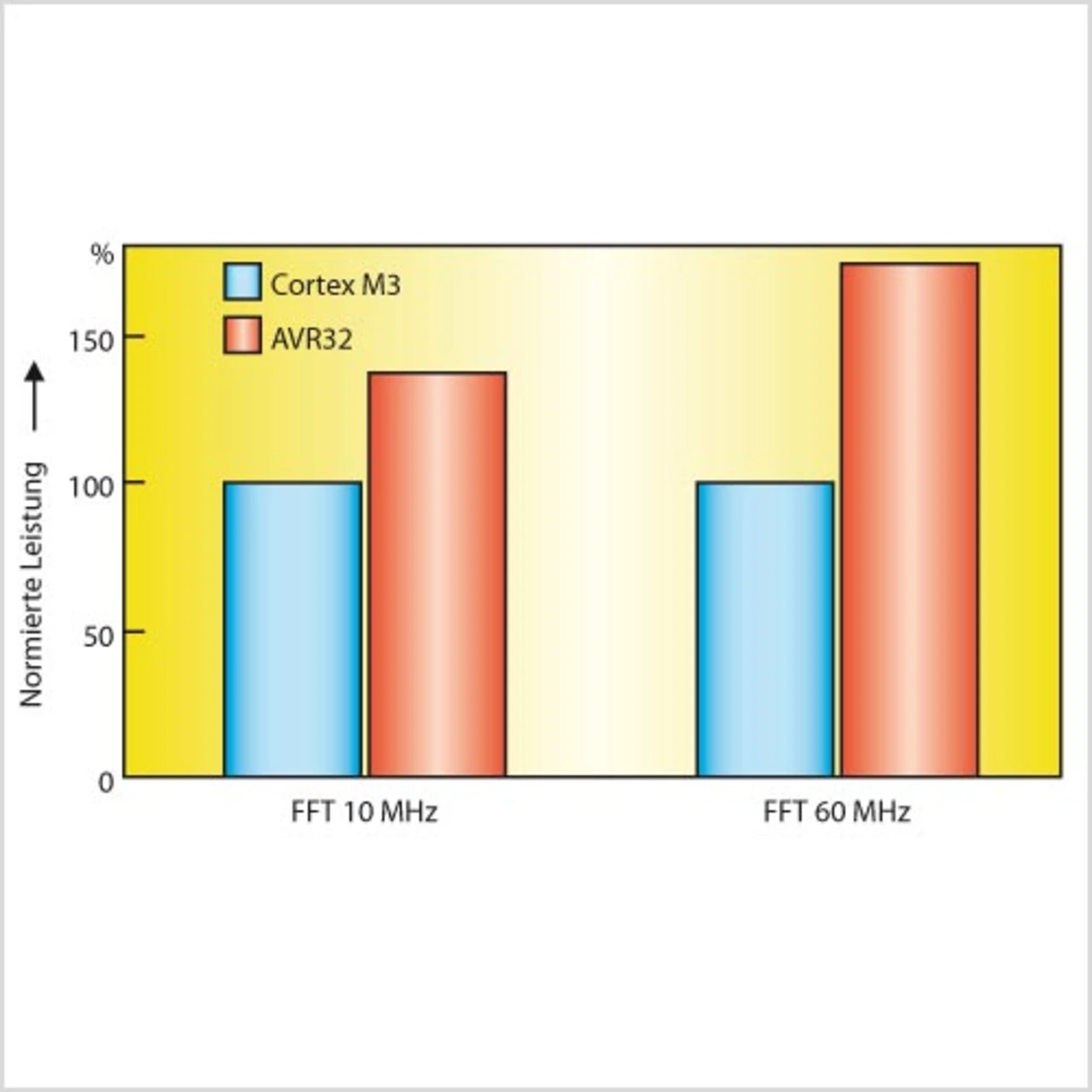 Bild 2 zeigt eine einfache Leistungs-Gegenüberstellung zwischen einem AVR32 UC3A und einem vergleichbaren Cortex-M3-basierten Controller eines Mitbewerbers. Bei der Ausführung einer FFT-Routine bei 10 MHz bzw. 60 MHz zeigen sich nicht nur die klaren Vorteile des DSP-Befehlssatzes, sondern auch die Auswirkungen der schnellen Flash-Architektur.