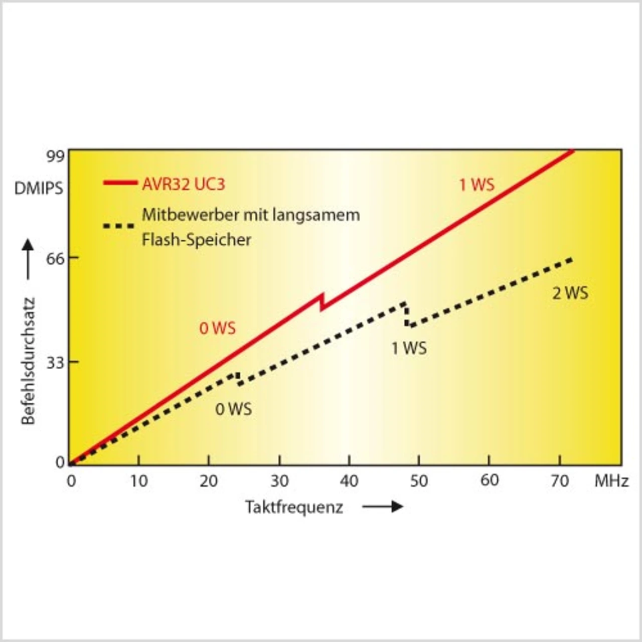 Der AVR32 UC3 hat einen äußerst schnellen Flash-Speicher, der bei der maximalen Taktfrequenz von 66 MHz mit einem einzigen Wait-State auskommt, während bei den meisten konkurrierenden Lösungen zwei Wait-States nötig sind. Welche Bedeutung diese Verbesserung hat, macht Bild 1 deutlich. Wann immer ein Anheben der Taktfrequenz das Einfügen eines zusätzlichen Wait-States notwendig macht, bedeutet das einen Leistungsverlust für das gesamte System. Die maximale Taktfrequenz eines Mikrocontrollers ist somit von untergeordneter Bedeutung, solange der Flash-Speicher langsam ist. Der schnelle Flash-Speicher des AVR32 UC3 aber lässt die Rechenleistung des Mikrocontrollers signifikant ansteigen.