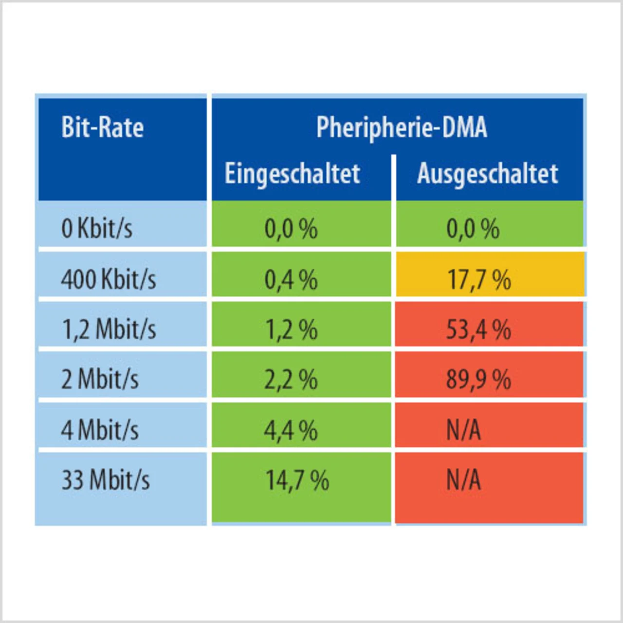 Vor einigen Jahren wurde der Peripherie-DMA-Controller erstmals in der SAM7-Architektur vorgestellt. Sein Nutzen wird in der Tabelle deutlich. Solange der Peripherie-DMA-Controller inaktiv ist, beträgt der maximale Datendurchsatz des SPI-Moduls ca. 1 Mbit/s, hierbei ist die CPU über die Hälfte der Zeit allein mit dem Transfer von zu sendenden oder empfangenen Daten beschäftigt. Der Peripherie-DMA-Controller erzielt auf dem SPI-Bus einen Datendurchsatz von 33 Mbit/s, wobei die CPU nur zu 15 % belastet wird.