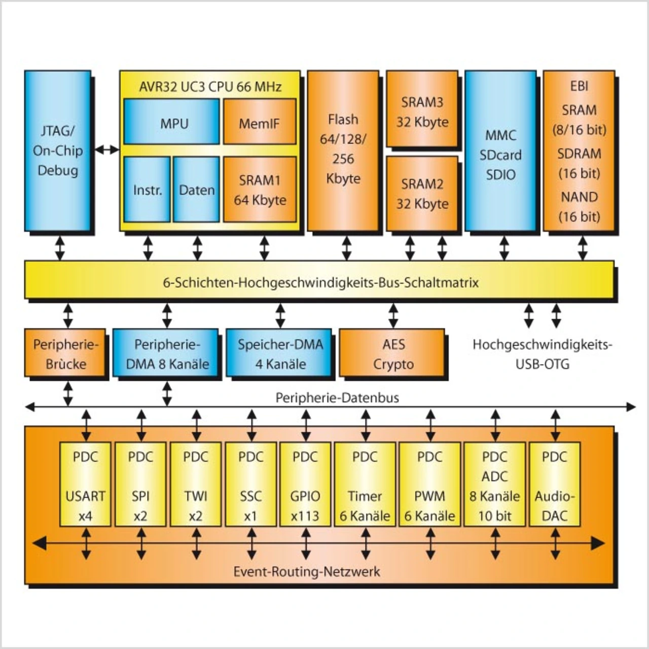 Die Einführung neuer hochleistungsfähiger Peripheriemodule setzt einen echten Speicher-zu-Speicher-DMA-Controller voraus. Bei den AVR32-UC3-Bausteinen mit Hochgeschwindigkeits-USB-Peripherie-Option ist das USB-Modul mit AES-Kryptographie und einem großen internen SRAM-Speicher kombiniert. Dabei ist der SRAM-Speicher so aufgeteilt, dass sich ein Speicherblock innerhalb der CPU befindet, um während der Programmausführung Single-Cycle-Zugriffe zu ermöglichen.